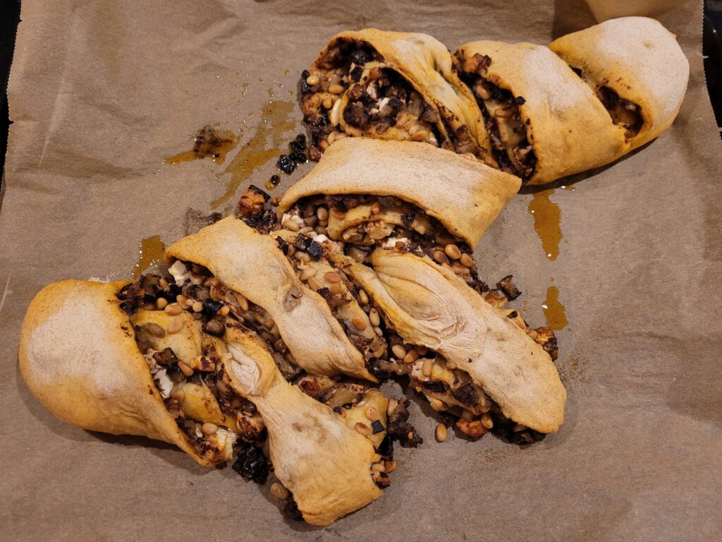 Den Teig von der Längsseite her aufrollen und mit der Naht aufs Backblech legen. Den Teig mehrmals ca. alle 4 cm schräg einschneiden. Die Schnitte sollten tief sein, sodass nur noch das untere Viertel des Teiges zusammenhängt. Anschliessend jeden zweiten Teigabschnitt vorsichtig auf die gegenüberliegende Seite der Rolle drehen (Ährenmuster). Klingt komisch, fühlt sich auch falsch an, wenn mans macht, ist aber besser so. Da der Teig nach dem Backen oben sehr kross wird und schwer zu schneiden ist ohne alles kaputt zu machen, ist dies ein wirklich praktischer Arbeitsschritt, der nicht nur raffiniert aussieht. Obwohl…vllt ist auch nur das tiefe Einschneiden schon ausreichend.