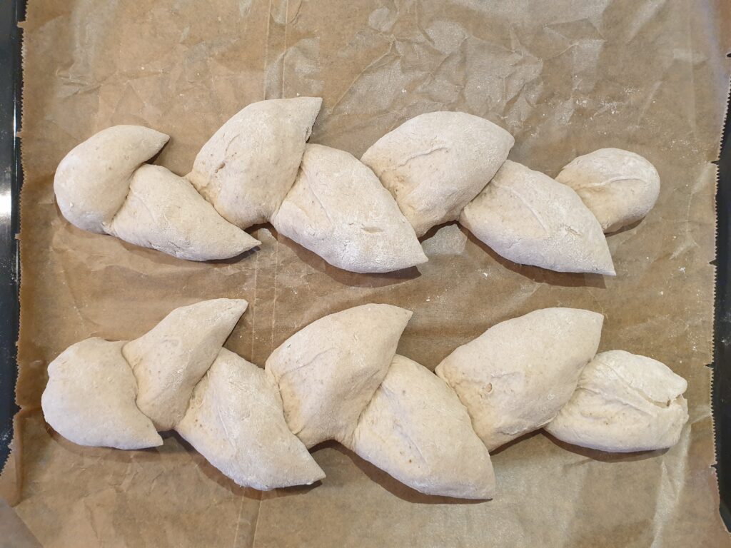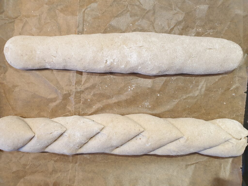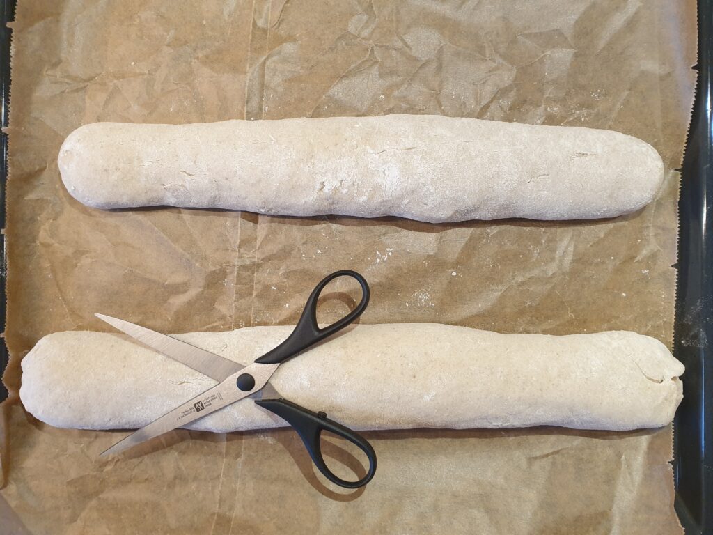 Am zweiten Tag den Teig zunächst 1–2 Stunden in der Küche bei Zimmertemperatur aufwärmen lassen. Im Anschluss wird der Teig auf einer mit Mehl bestäubten Arbeitsfläche weiter verarbeitet: Der Teig wird in 4 Stücke geteilt. Im Anschluss werden die Stücke zu etwa 30 cm langen Baguettes geformt und mit der Naht nach unten auf ein mit Backpapier ausgelegtes Backblech gelegt. Nun mit der Schere die Baguettes einschneiden und die Seitenteile für die Ähre auseinander ziehen, Teig etwa 30 Minuten ruhen lassen.