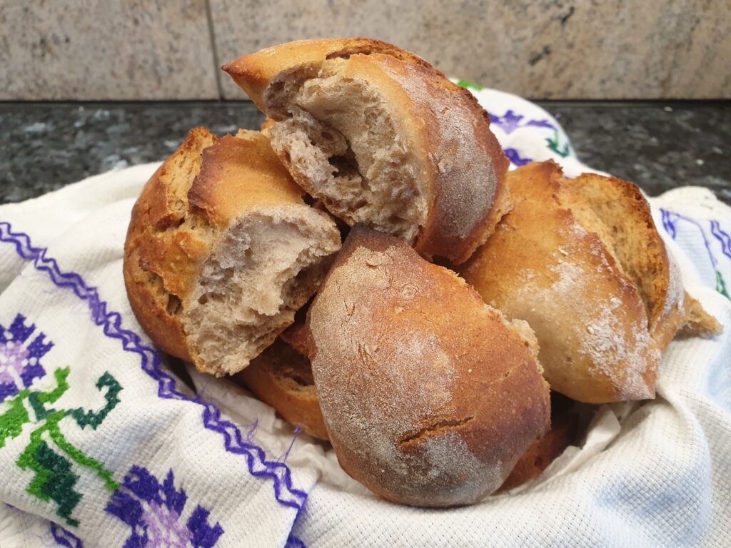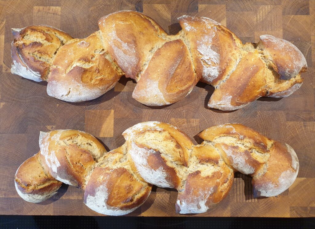 Nicht mit dem Essen spielen – aber hier ergibt die Spielerei ein hübsches Ähren-Baguette, und das auch noch mit Sauerteig. Daher für dies Brot am Tag zuvor beginnen, der Teig muss über Nacht gehen. Die Ähren des Brotes sind eine nette Variante, Roggen-Dinkel-Brötchen zu servieren.