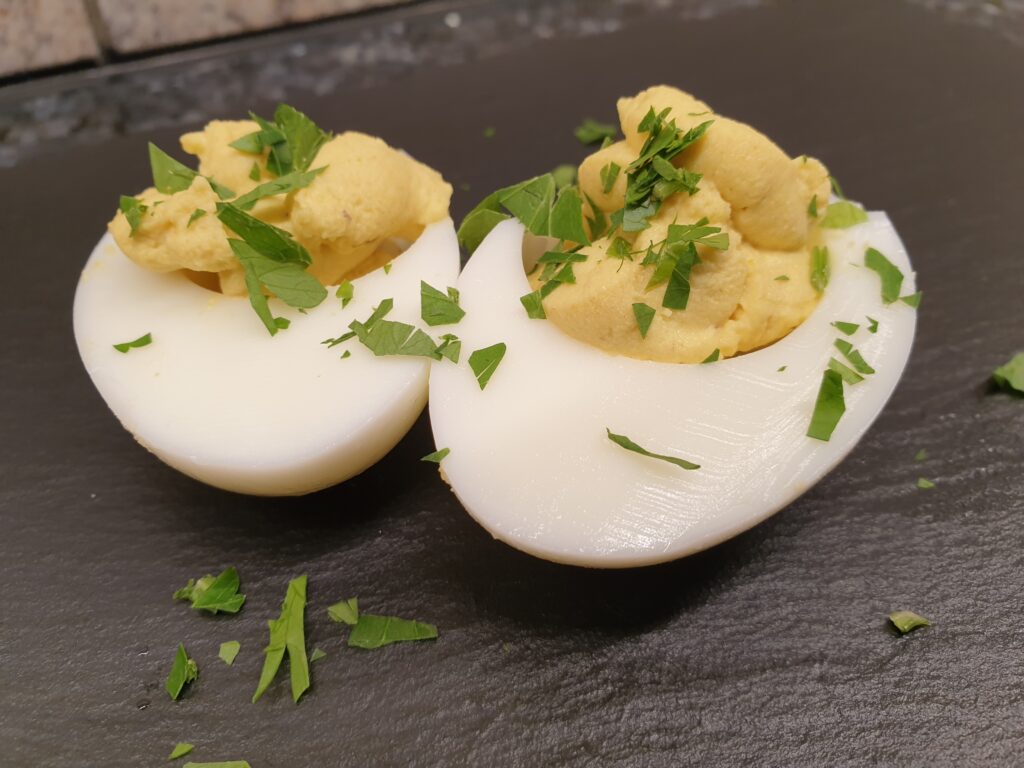 Deviled Eggs sind nicht schwer herzustellen, vorausgesetzt, die dafür vorgesehenen Eier lassen sich gut pellen. Das Wasser dazu zum Kochen bringen, die Eier in einer Lage in den Topf geben und 13 Minuten abgedeckt auf reduzierter Hitze köcheln lassen. Die Eier dann in eine Schale mit zwei Tassen kaltem Wasser und zwei Eiswürfeln geben und darin 15 Minuten kühlen lassen, erst dann pellen.