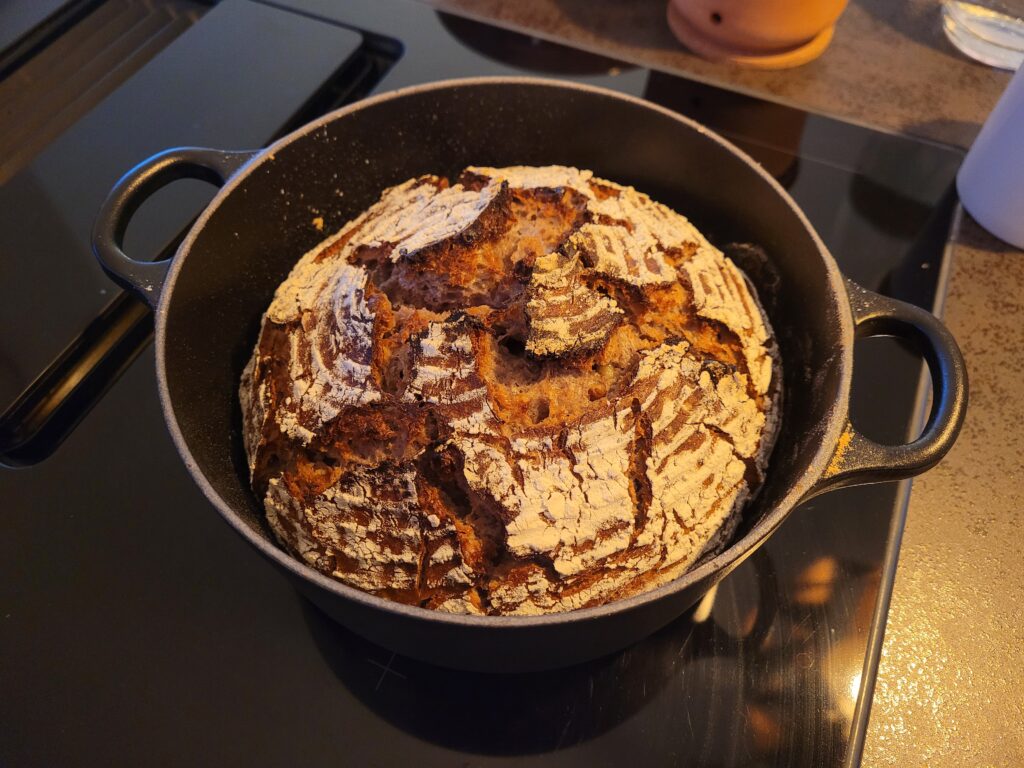 Ofen inzwischen samt Gusseisen- oder Tontopf auf 250 Grad erhitzen (Ober-/Unterhitze). Teig vorsichtig in den Topf legen (Achtung, nicht Verbrennen!) und mit Deckel zu bei 230 Grad für 30 Minuten backen. Dann nochmals 15 Minuten ohne Deckel weiterbacken. Anschliessend auf einem Rost auskühlen lassen.