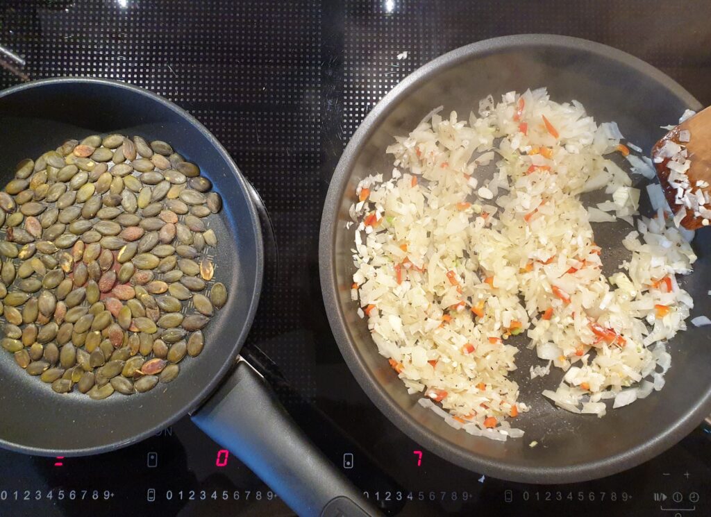 Kürbiskerne separat langsam in der Pfanne rösten.