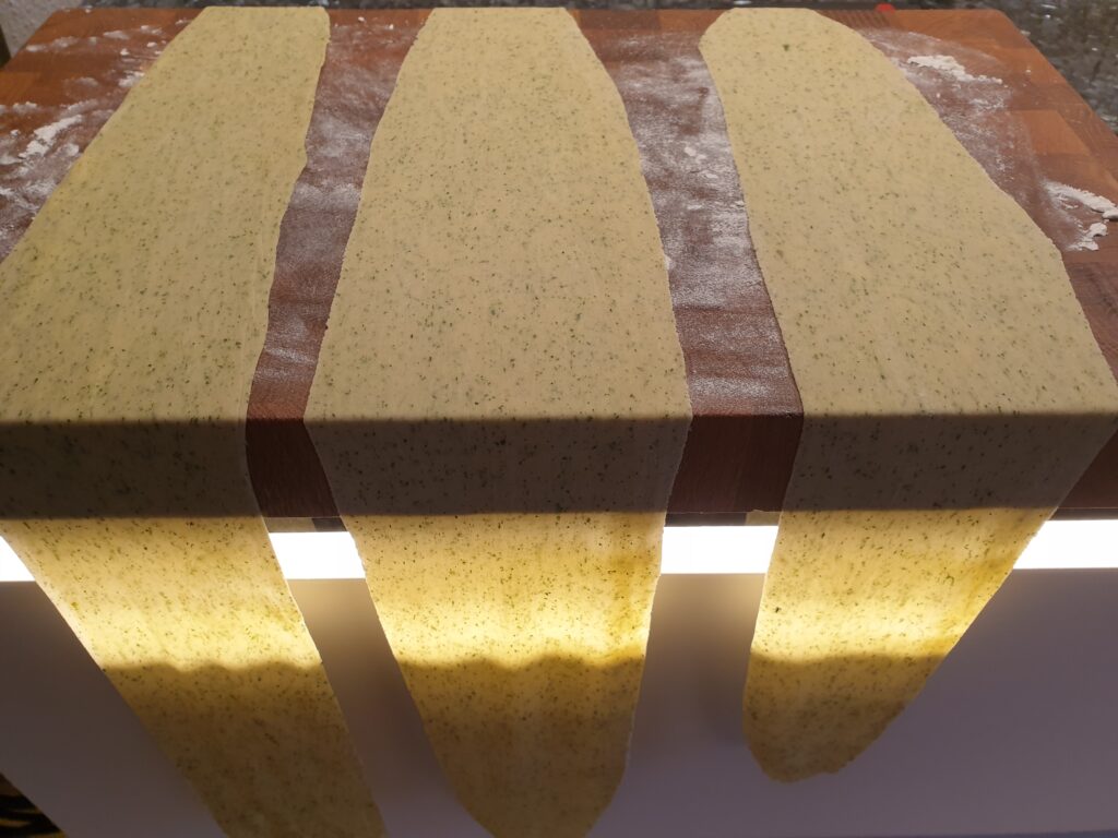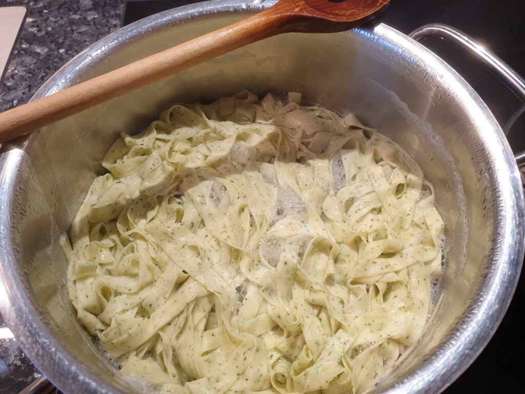 Pasta nach Rezept zubereiten (oder den einfachen Weg mit Fertigpasta wählen ;)) und in etwa 1,5 bis 2 Litern Salzwasser al dente kochen, durch ein Sieb abgießen. Wer mag kann dem Pastateig etwas getrocknetes Spinatpulver zugeben, wenn vorrätig.