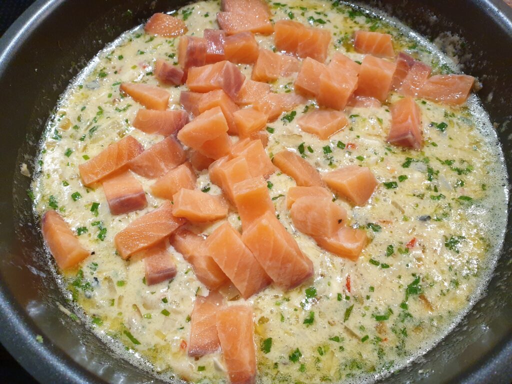 - 200 g Lachs, gewürfelt, alternativ 150 g kleine Shrimps