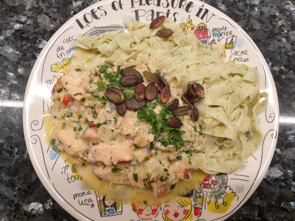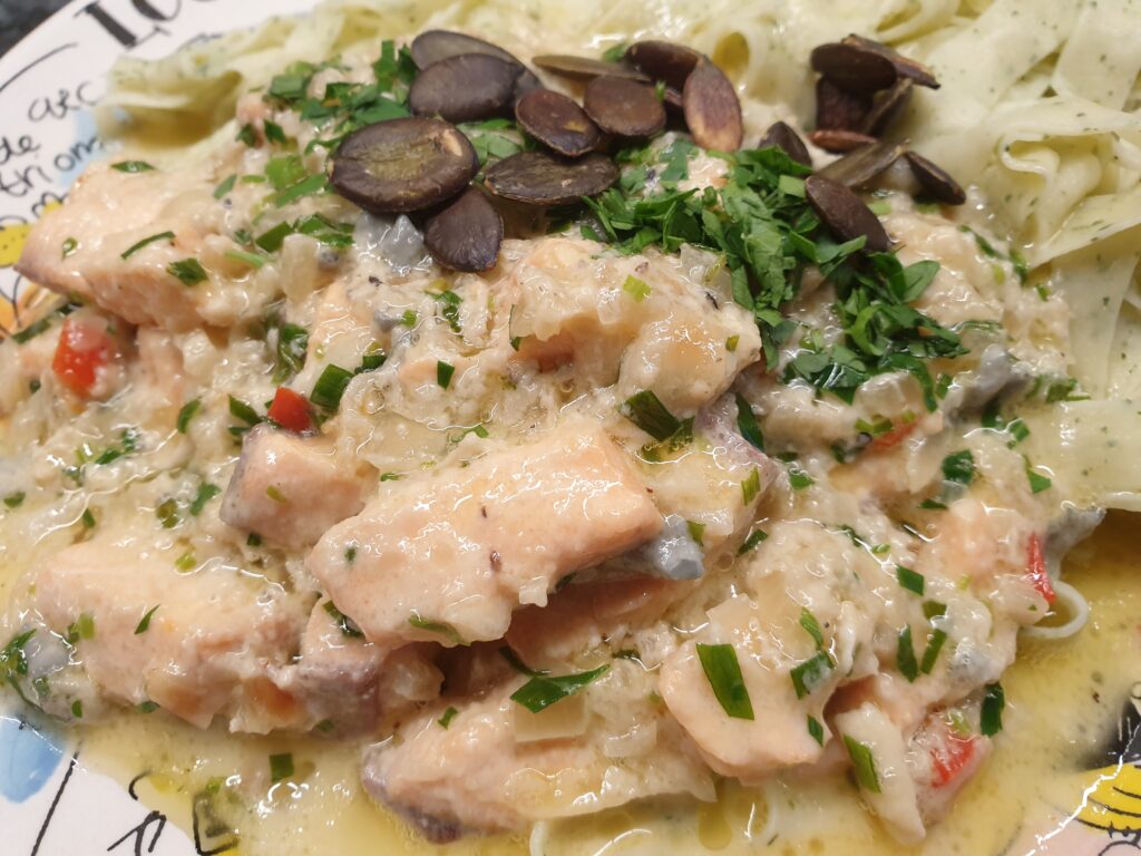 Für die Sauce Butter in einer zweiten Pfanne schmelzen und Zwiebel darin anbraten, Jalapeno und Knoblauch zugeben, mit etwas Weißwein ablöschen. Nun die Milch-Sahne Mischung zugeben und köcheln lassen, den Esslöffel Honig zugeben. Nun Käse zugeben und in der Sauce auf sehr kleiner Hitze schmelzen lassen. Lachs ganz zum Schluss zugeben und kurz (etwa 2 Minuten!) mit garen lassen – der Fisch sollte nicht trocken werden. Anrichten und mit Kürbiskernen und etwas Petersilie bestreut servieren.
