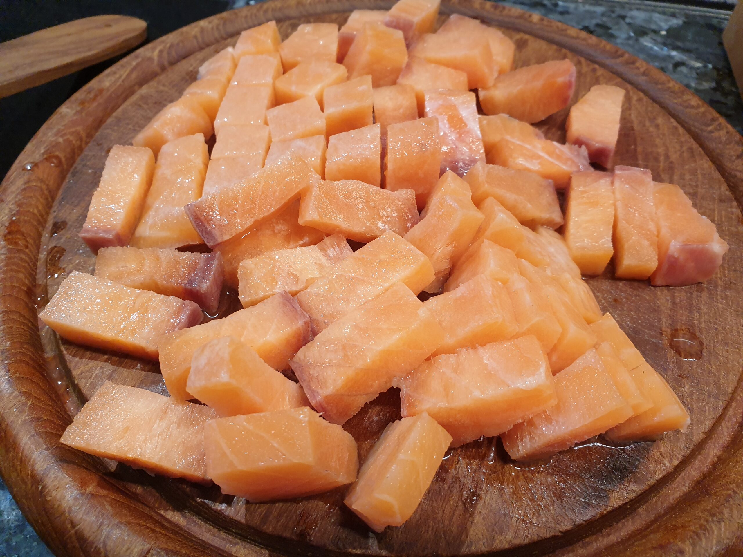 Zur Vorbereitung Lachs würfeln und mit Limettensaft säuern, leicht salzen.