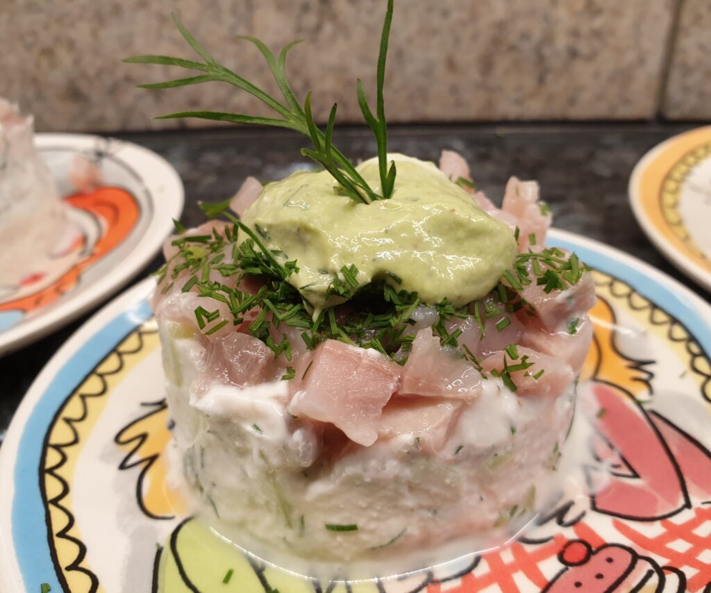 Die Gurkenscheiben als Unterlage auf einen Servierteller platzieren. Nun einen runden Ausstecher (kleiner Durchmesser) in die Mitte setzen, hälftig mit der Gurkensalatmischung füllen und dann mit den Matjeswürfeln auffüllen. Nun den Servierring langsam nach oben wegziehen. Tatar mit einem Klecks von der Gurkenmischung, die mit etwas Bärlauchpesto vermengt wurde, und den gehackten frischen Kräutern garniert servieren.