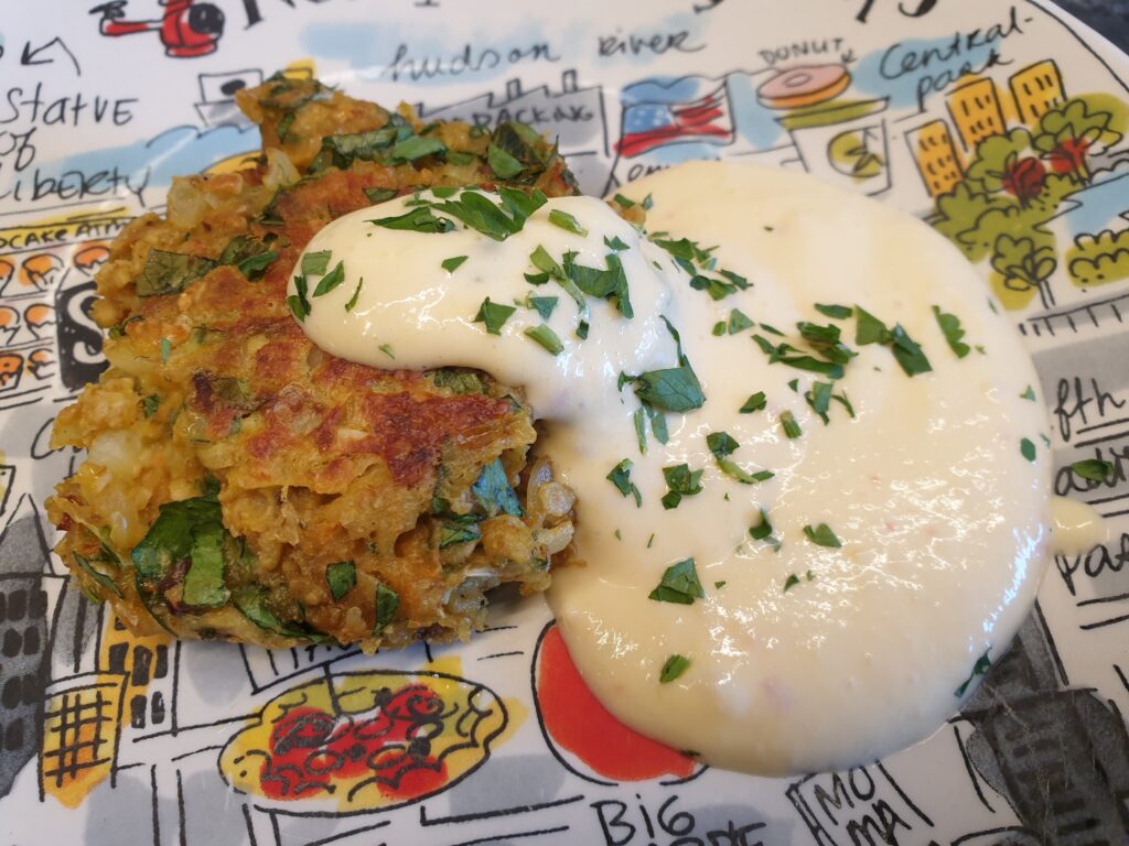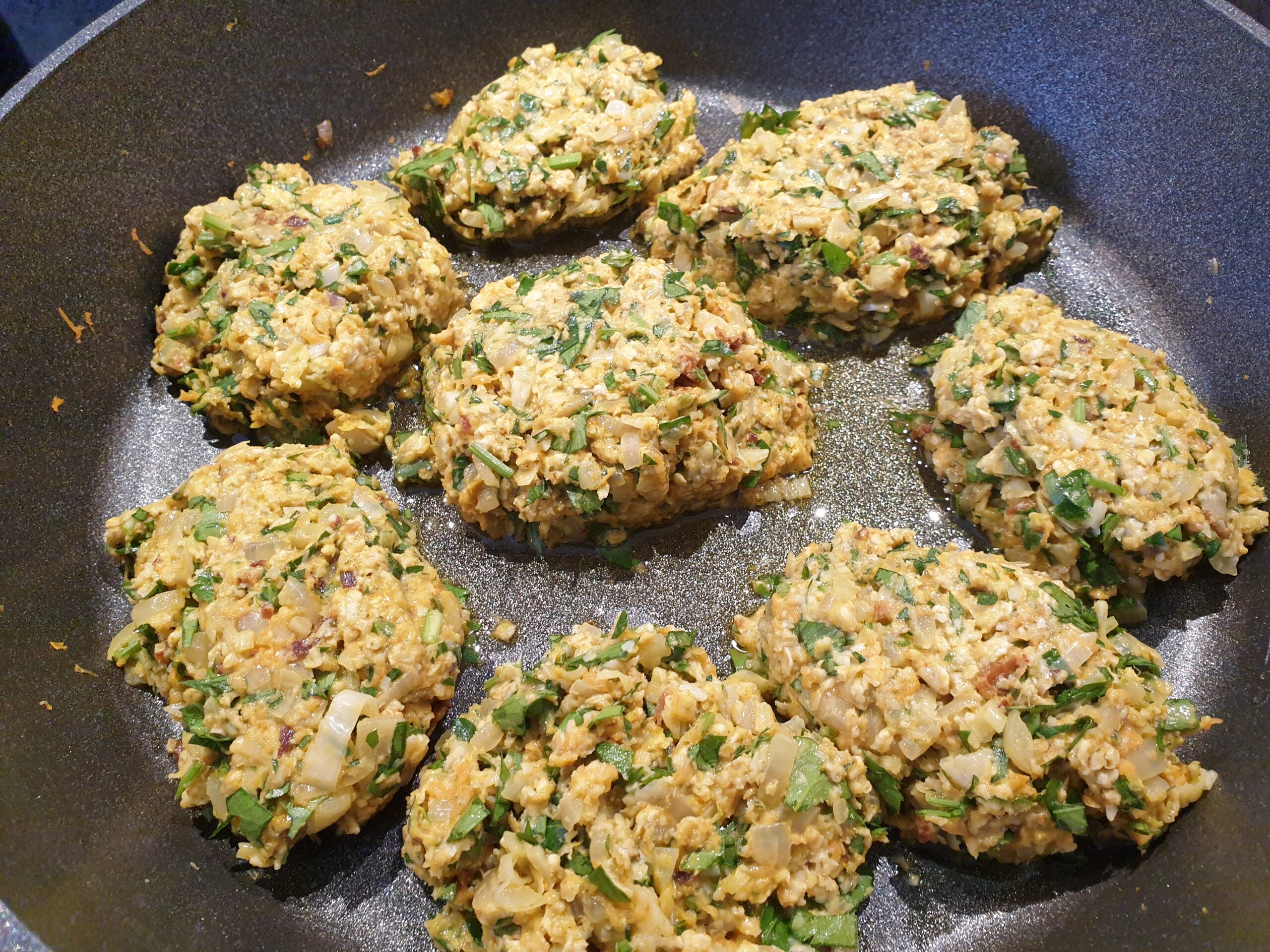 Für den Mangodip den fein geschnittenen Ingwer, Mango, Crème fraîche, Ingwer und Knoblauch und Chili mit einem Schuss Limettensaft kombinieren und im Blender pürieren. Vegetarische Frikadellen mit Mangodip und frischen gehackten Kräutern servieren.