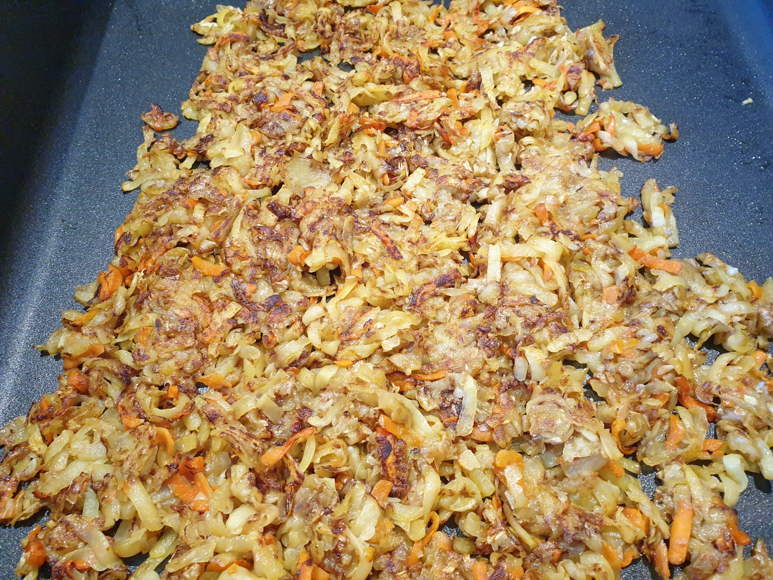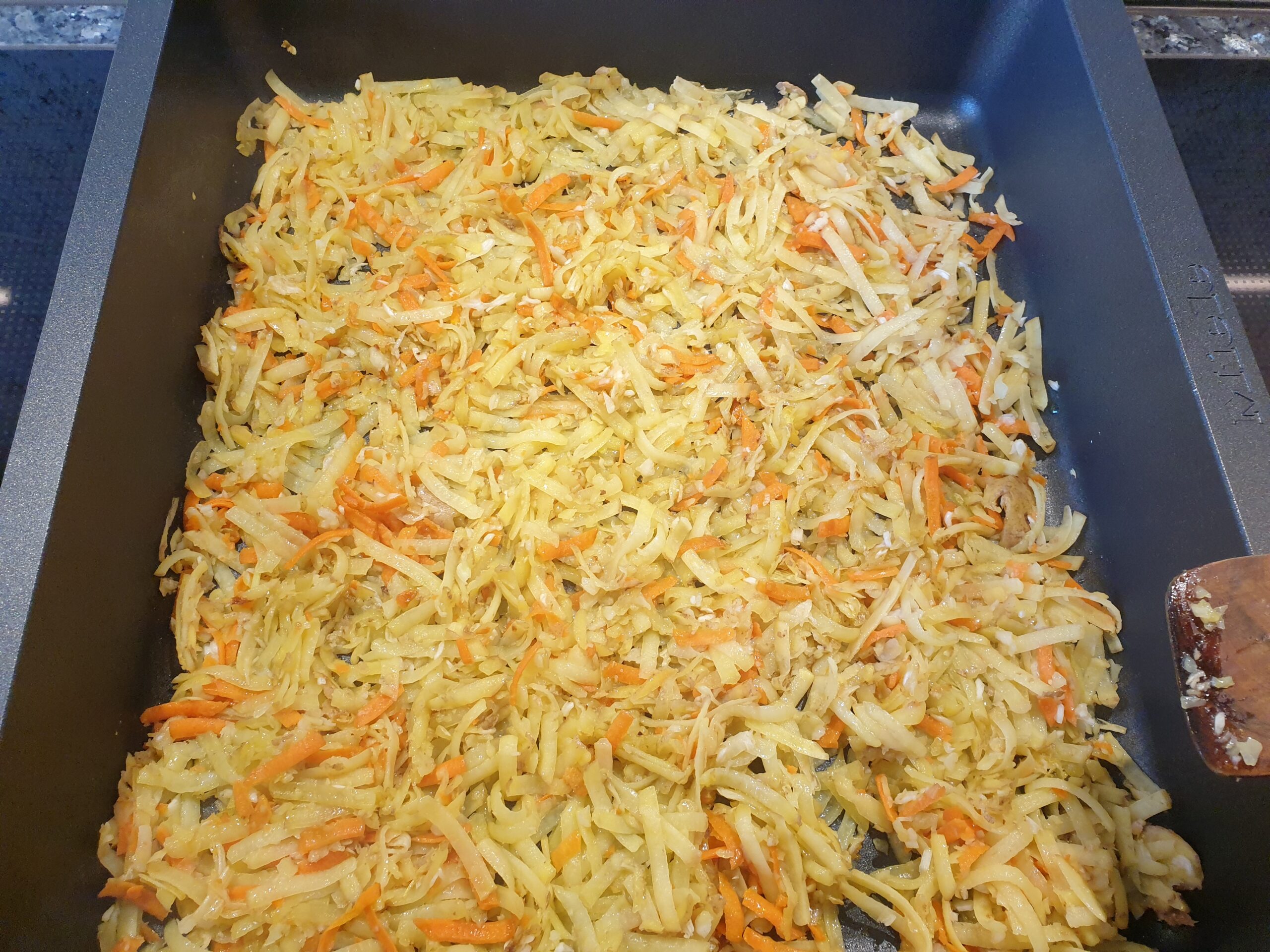 Kartoffeln, Möhren und Knoblauch mit einem Schuss Olivenöl langsam und gleichmäßig auf kleiner Stufe bräunen lassen – guten Appetit!