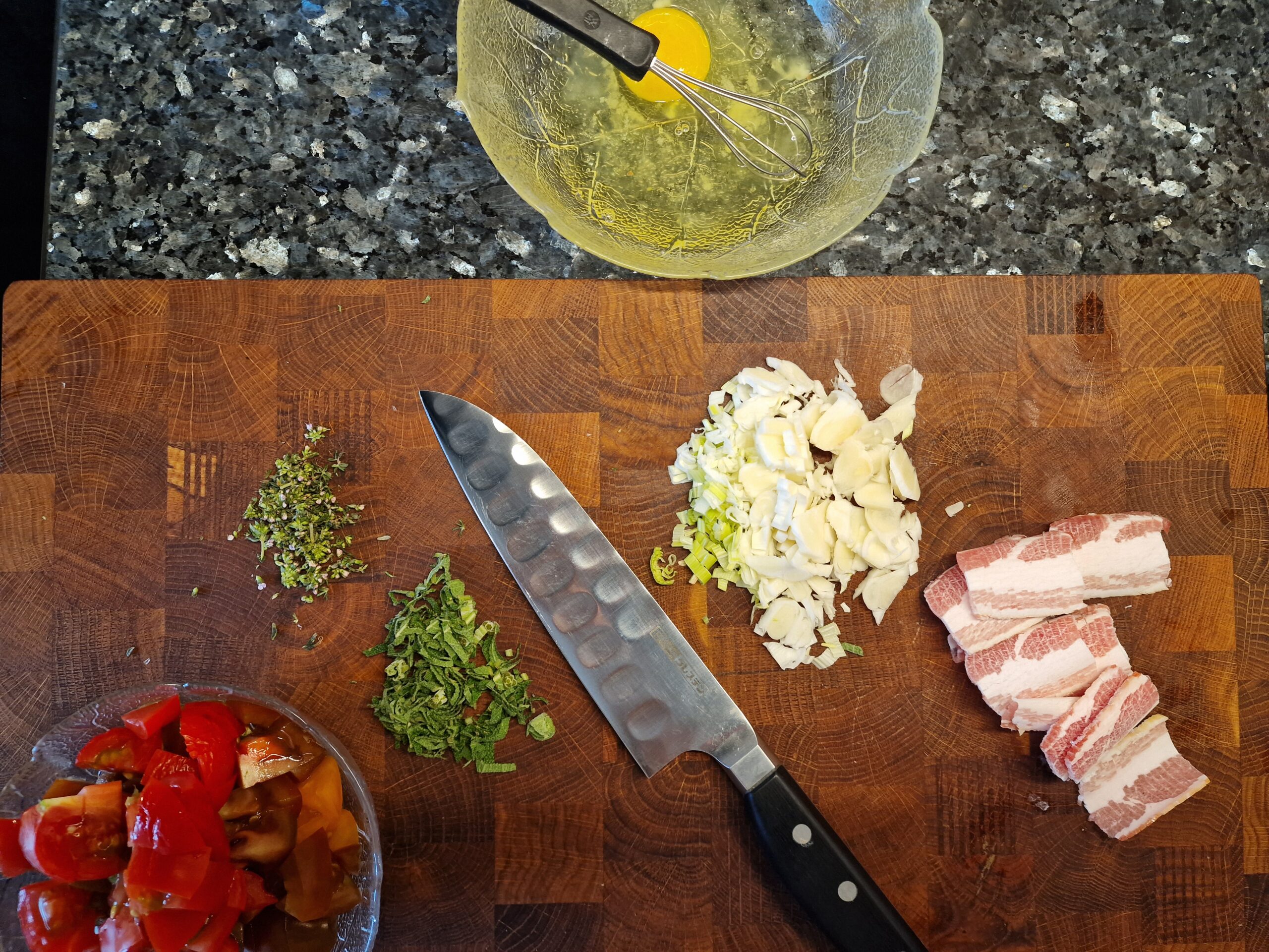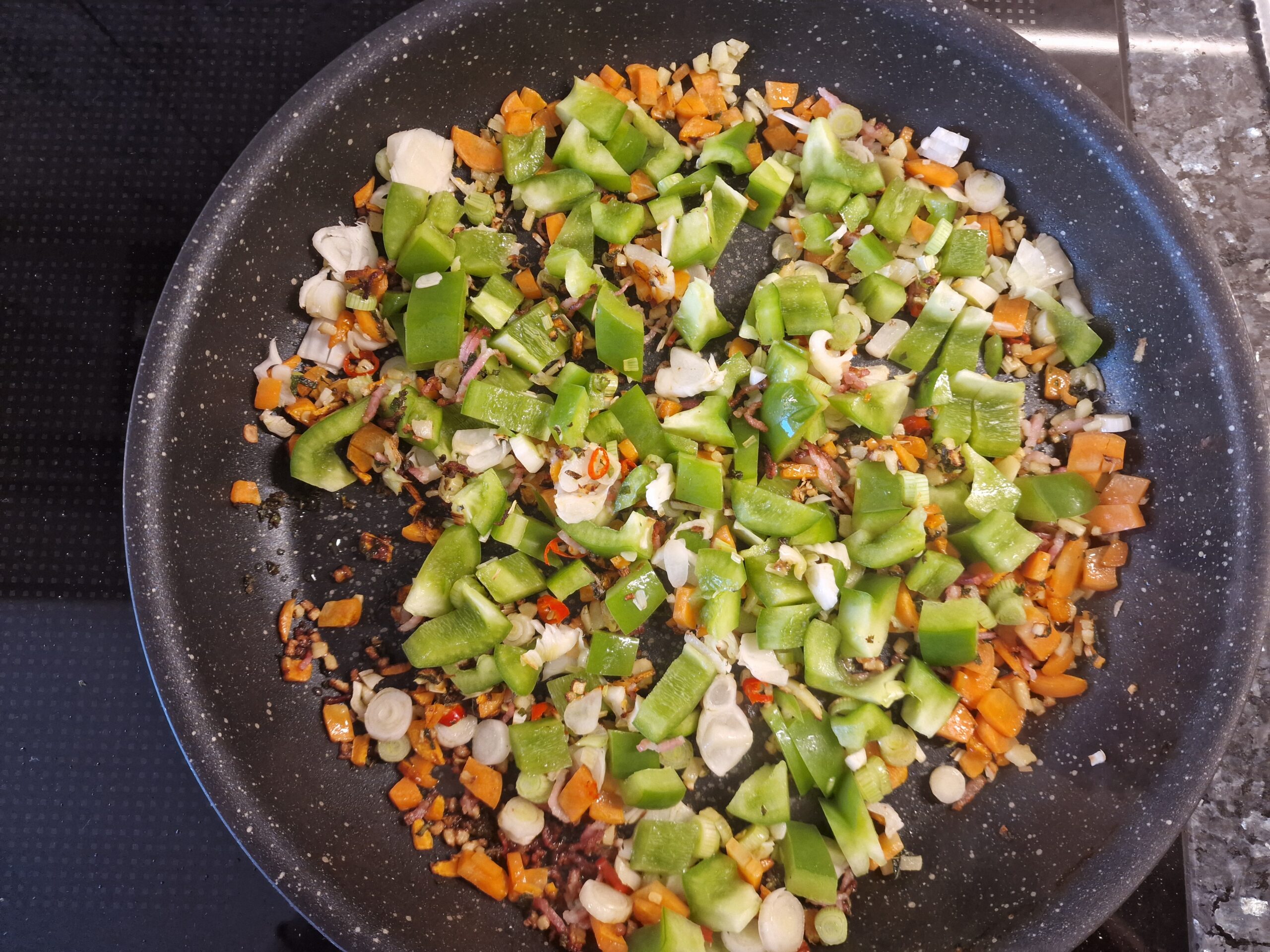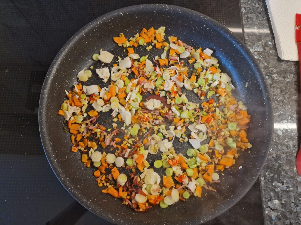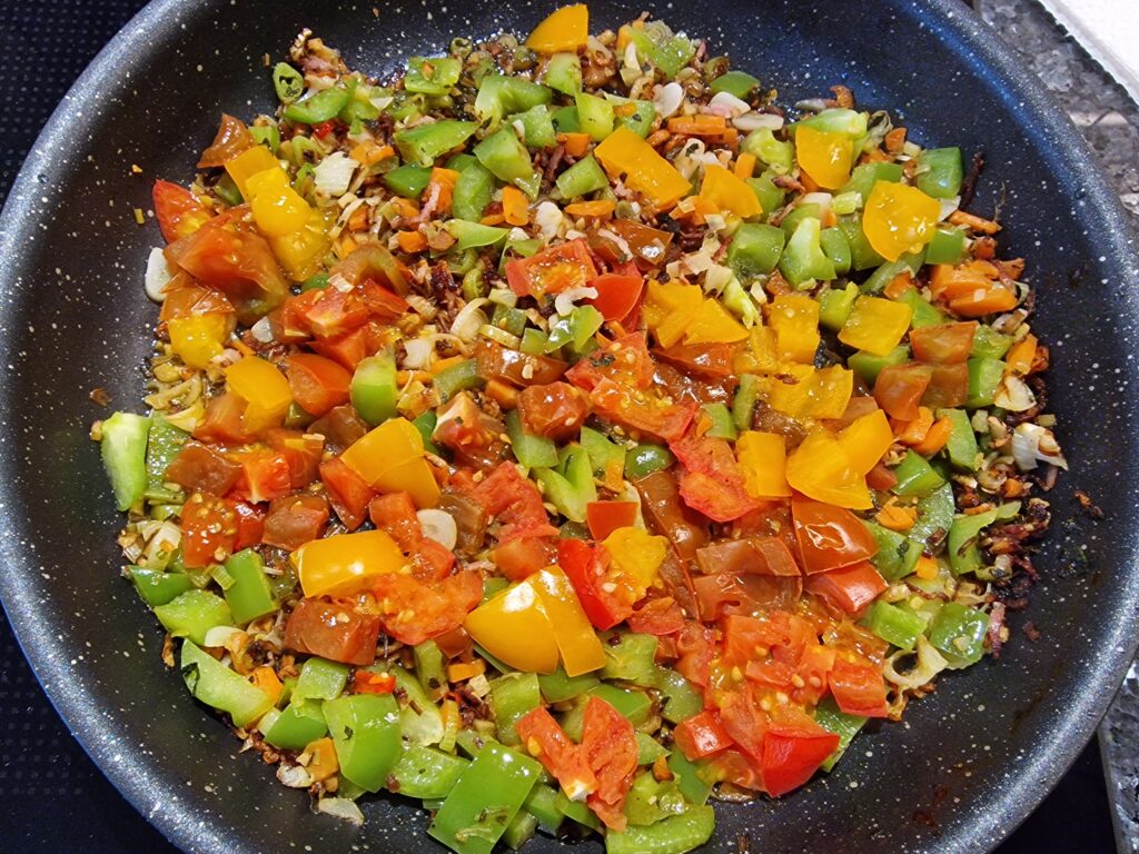 Ingwer in der Pfanne in Olivenöl anbraten, Kräutermix und Knoblauch zugeben und gleichfalls anbraten. Nun die Zwiebel und Gemüsemix zugeben, Tomaten zuletzt, falls vorhanden, und mit etwas Marsala ablöschen, falls dervGemüsemix anzusetzen droht. Alles auf mittlerer Stufe für 8-10 Minuten in einer ofenfesten Pfanne anbraten, gegebenenfalls abdecken.