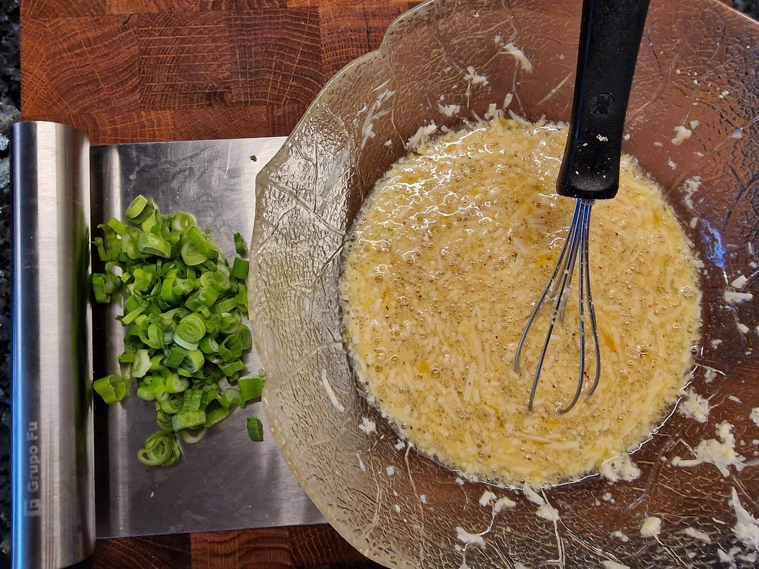 Parmesan, Eiweiß und die beiden Eier verquirlen, mit Salz, Pfeffer und etwas Muskatnuss würzen.