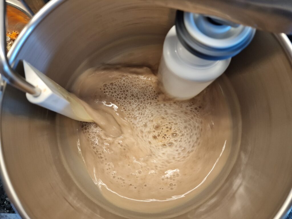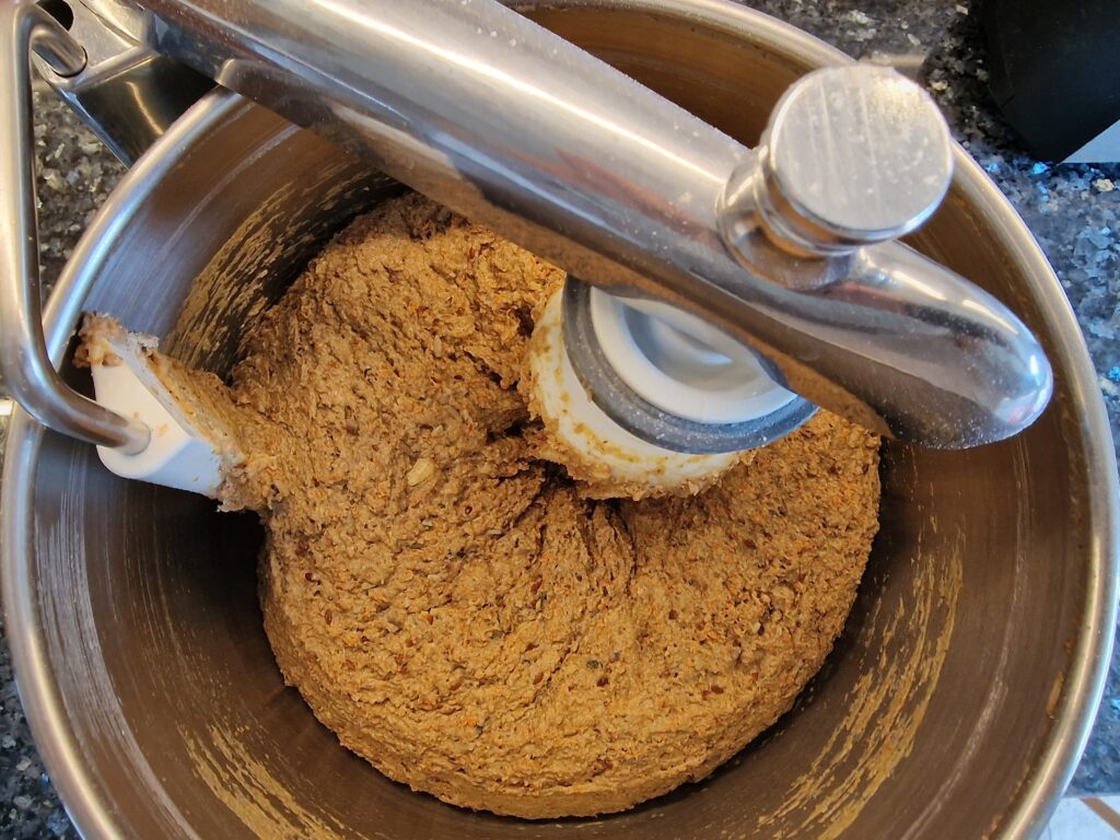 Vorteig aus Honig, Hefe, Salz und etwas Mehl ansetzen und etwas 15 Minuten ruhen lassen, bis-der Teig leicht schäumt. Alle Zutaten nun bis auf die Möhren miteinander in der Maschine verkneten. Zum Ende hin die geraspelten Möhren zugeben, nochmals gründlich kneten und mindestens 1 Stunde gehen lassen oder bis sich der Teig verdoppelt hat.
