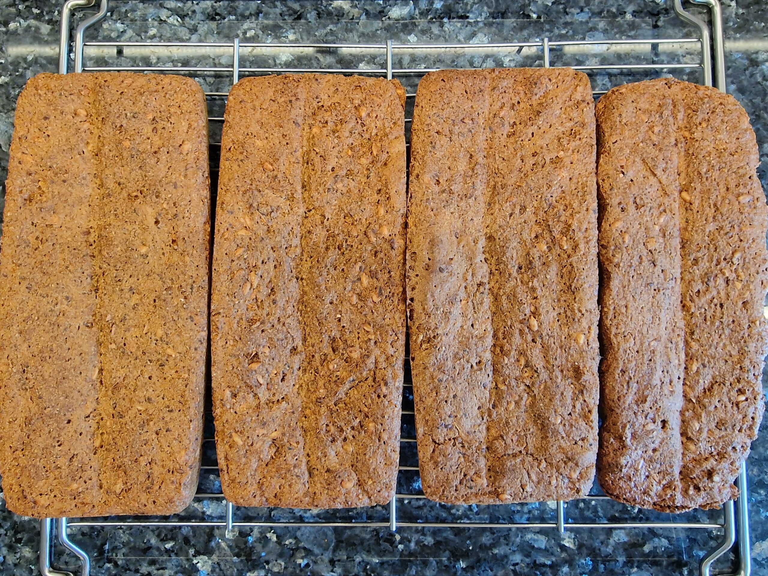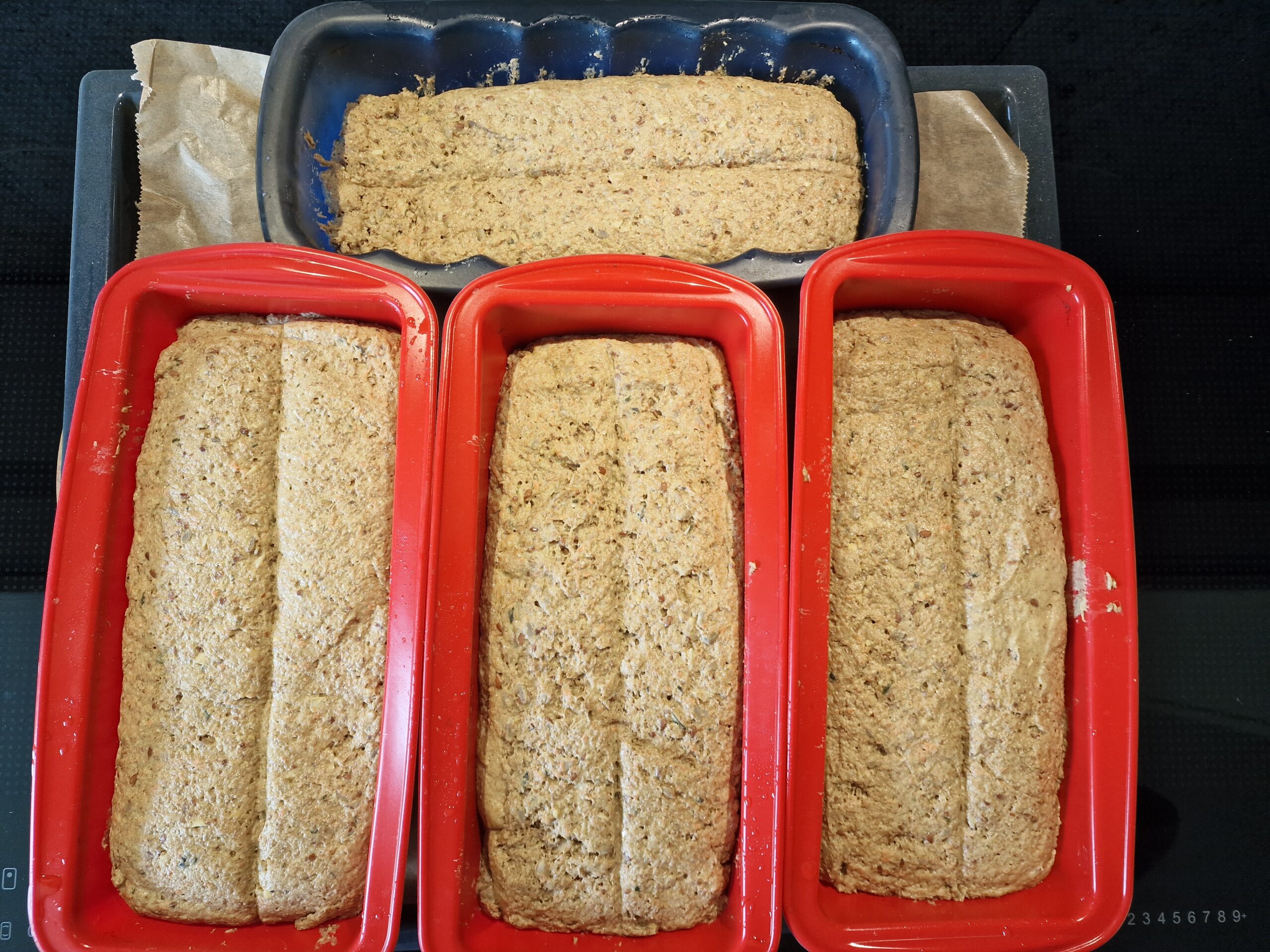 Den Teig auf einer bemehlten Arbeitsfläche kneten, in Kastenformen füllen. Der Teig klebt stark, daher den Teig mit etwas Öl glätten und längs einschneiden. Nochmals 45 Minuten gehen lassen oder bis sich der Teig verdoppelt hat.