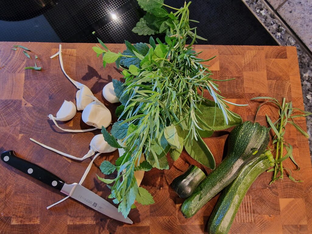 - 1-2 Stängel Estragon, 1 Stängel Rosmarin, 1 Stängel Salbei (Blättchen gehackt)