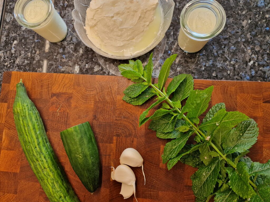 Für das Tzaziki Gurke und gepressten Knoblauch sowie die fein gehackten Minz-Blättchen mit einem Teil des Joghurts, einem Schuss Limettensaft und etwas Olivenöl vermengen und pürieren. Den Rest des Joghurts und Quark zugeben, nun mit Salz, Pfeffer und einer Prise Zucker würzen.