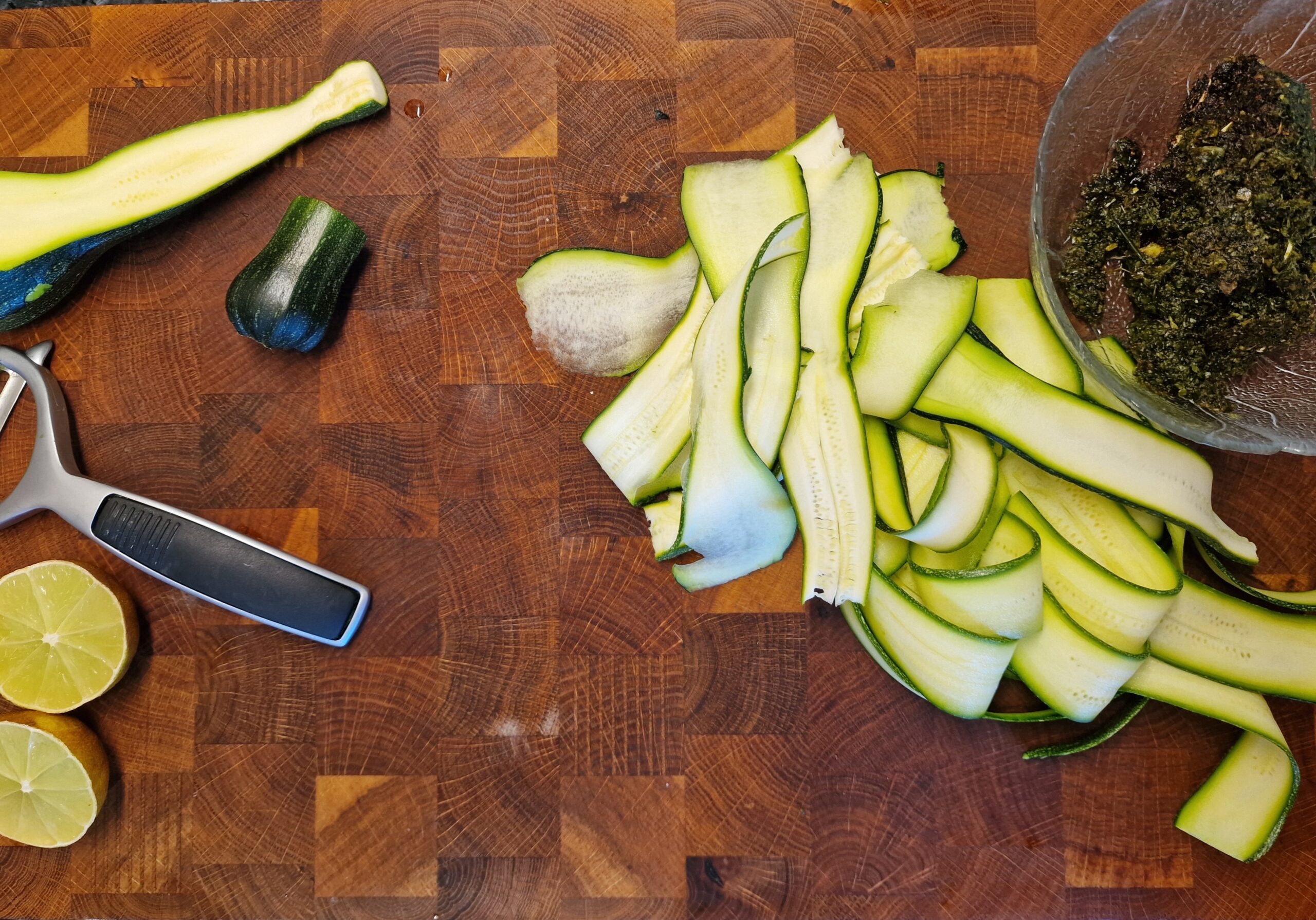 - 1 Zucchini, mittelgroß, längs in feine Scheiben geschnitten