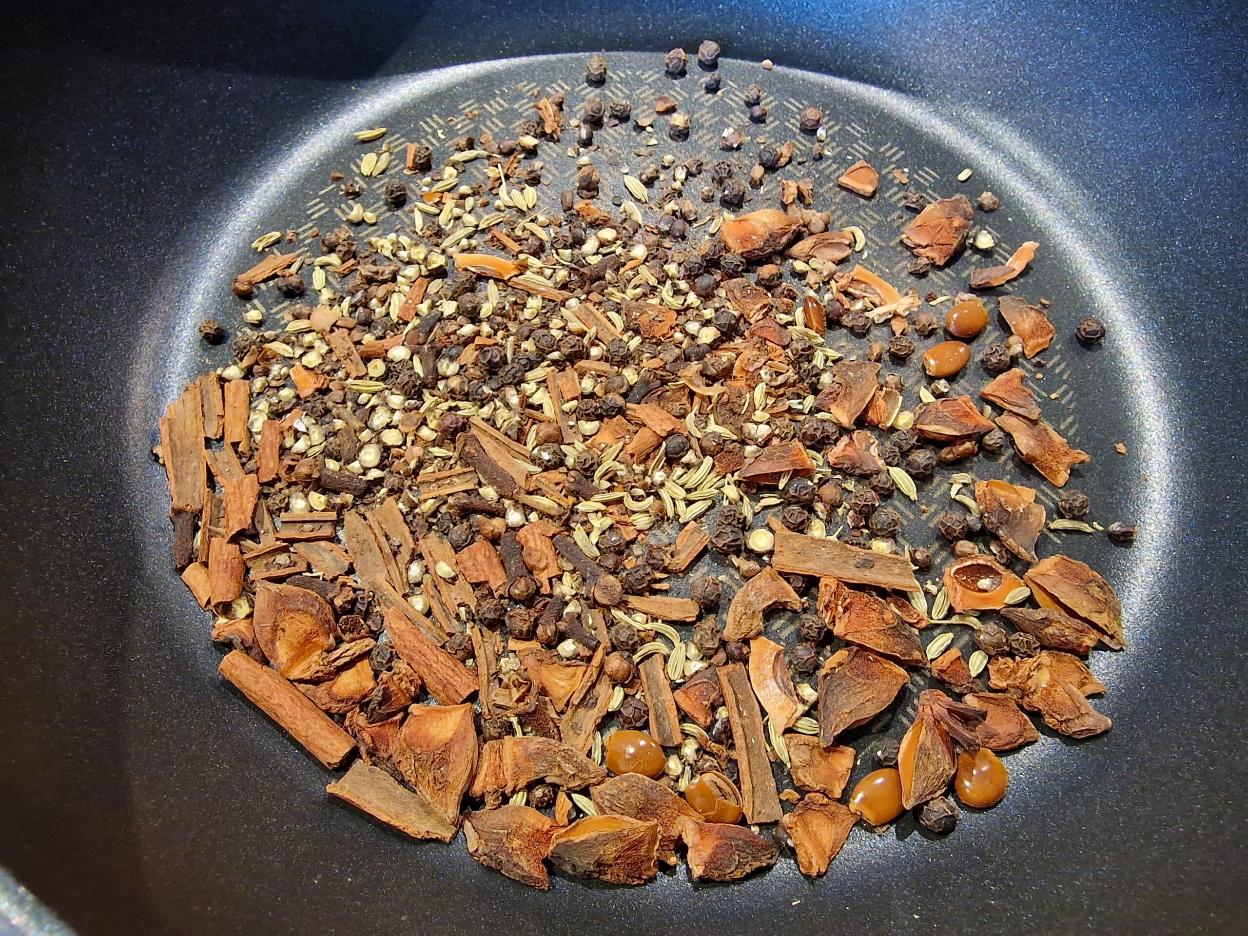 Die Gewürze werden zunächst grob mit einem Mörser zerstoßen, dann kurz in einer Pfanne fettfrei angeröstet