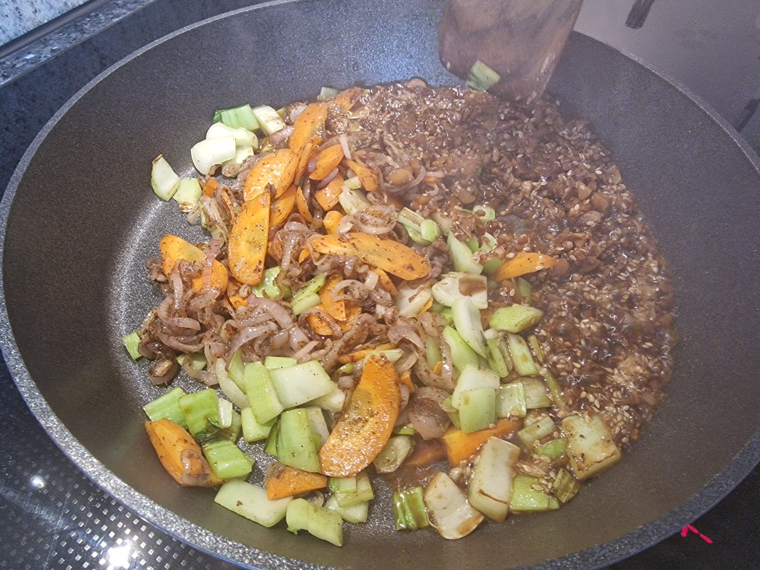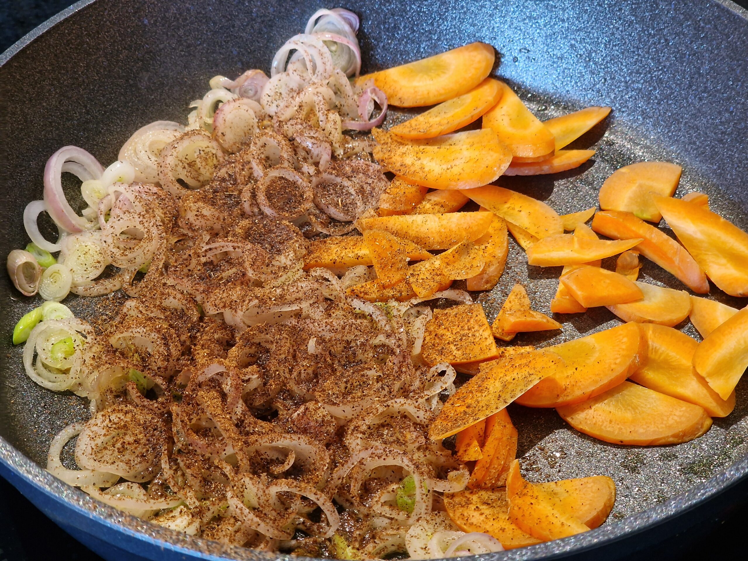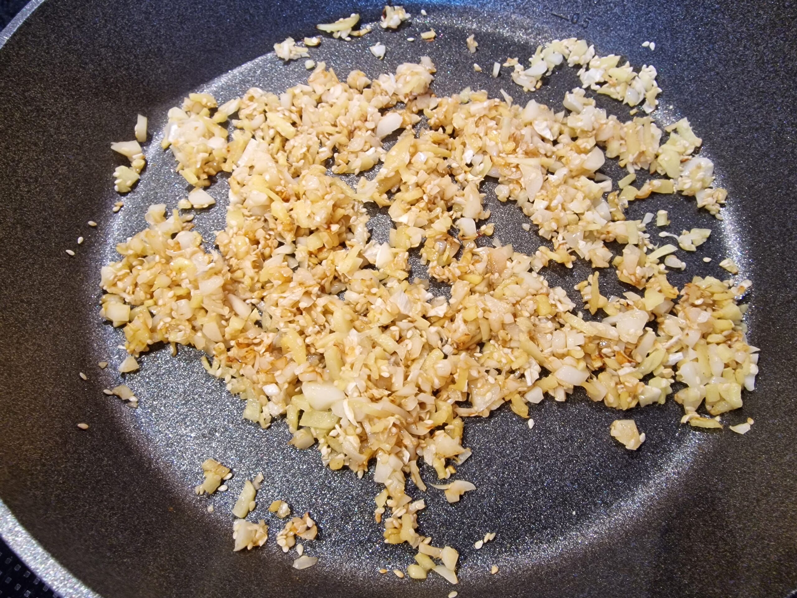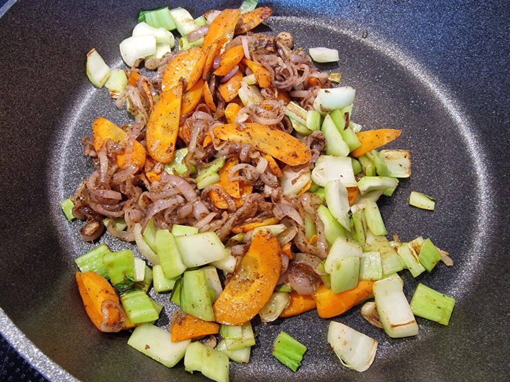 Nun Sesamöl in der Pfanne erhitzen, Zwiebeln und Karotten sowie den Teelöffel braunen Zucker oder Honig zugeben und das Ganze sanft karamellisieren lassen. Dabei ist es wichtig, immer wieder umzurühren, damit nichts ansetzt.