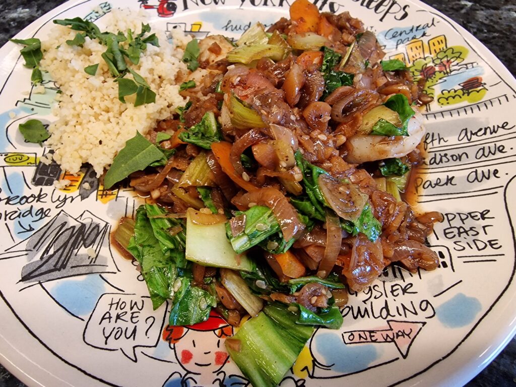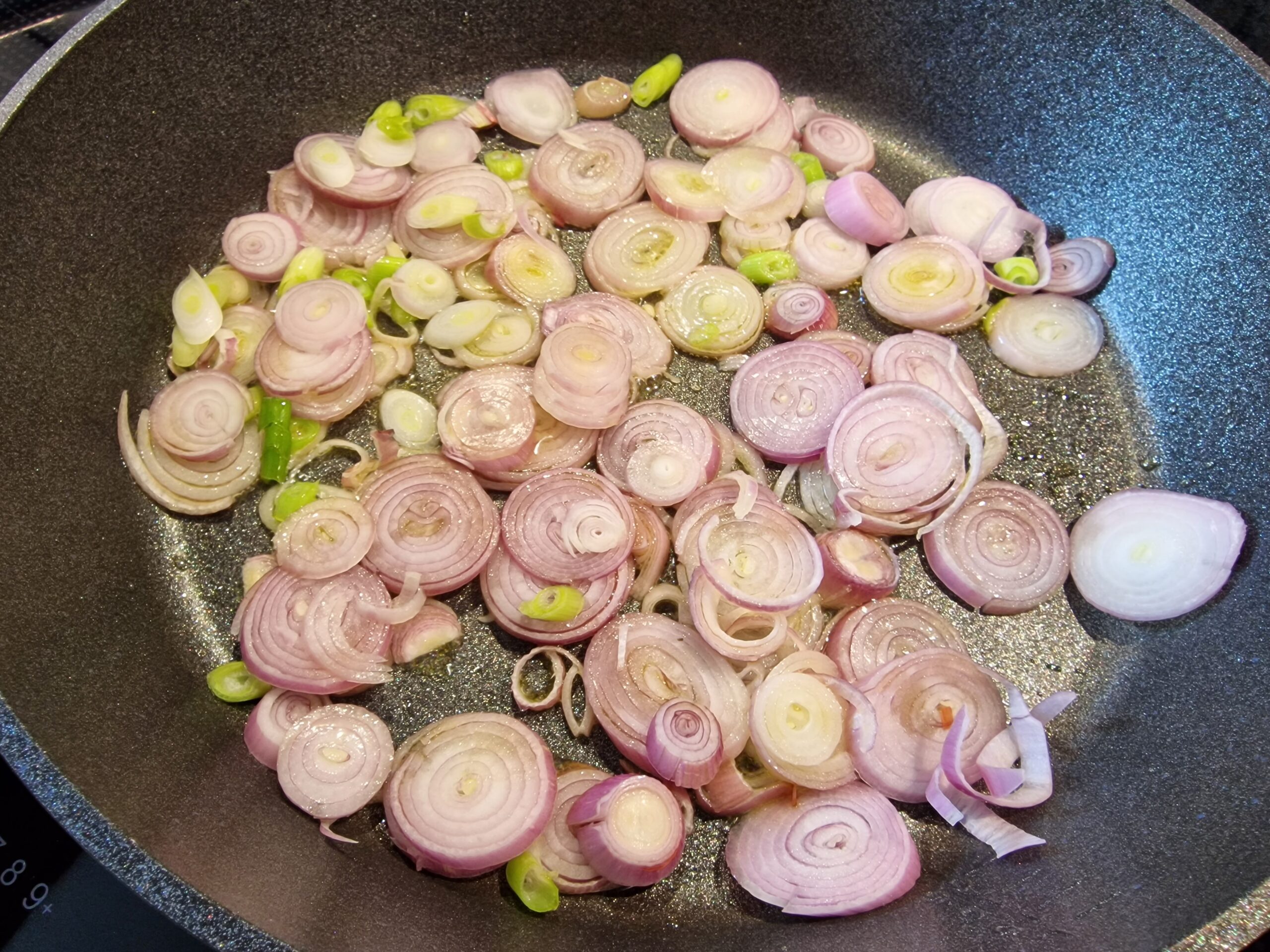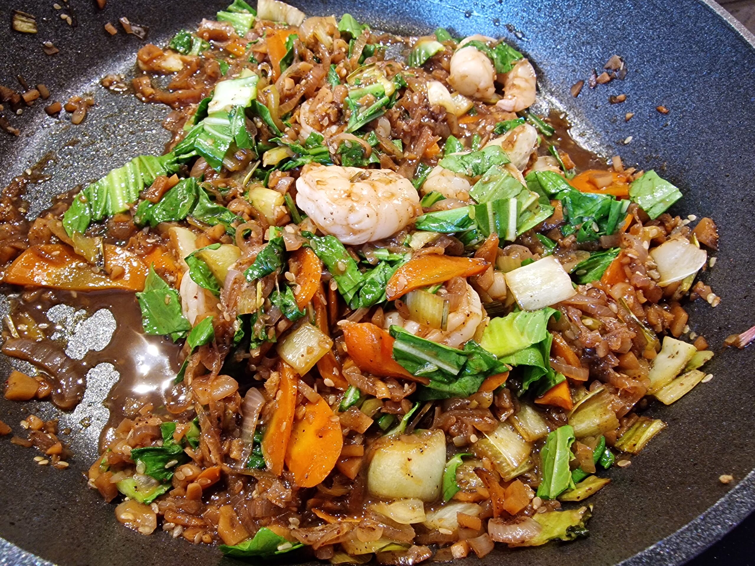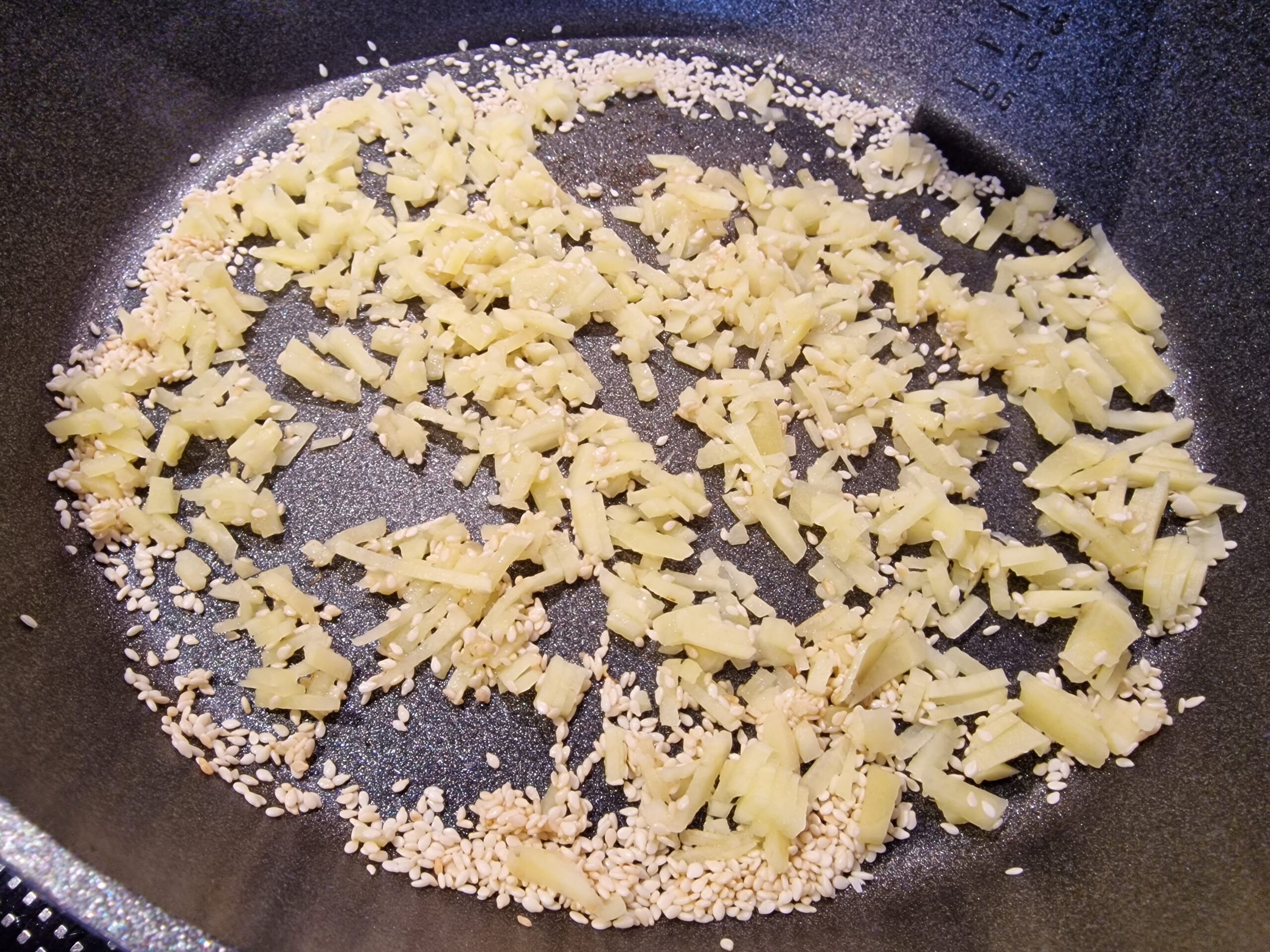 Nun Sesamöl in der Pfanne erhitzen, Zwiebeln und Karotten sowie den Teelöffel braunen Zucker oder Honig zugeben und das Ganze sanft karamellisieren lassen. Dabei ist es wichtig, immer wieder umzurühren, damit nichts ansetzt.