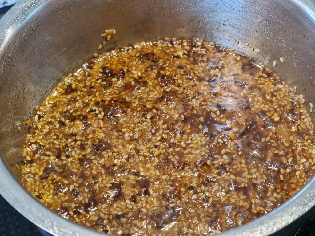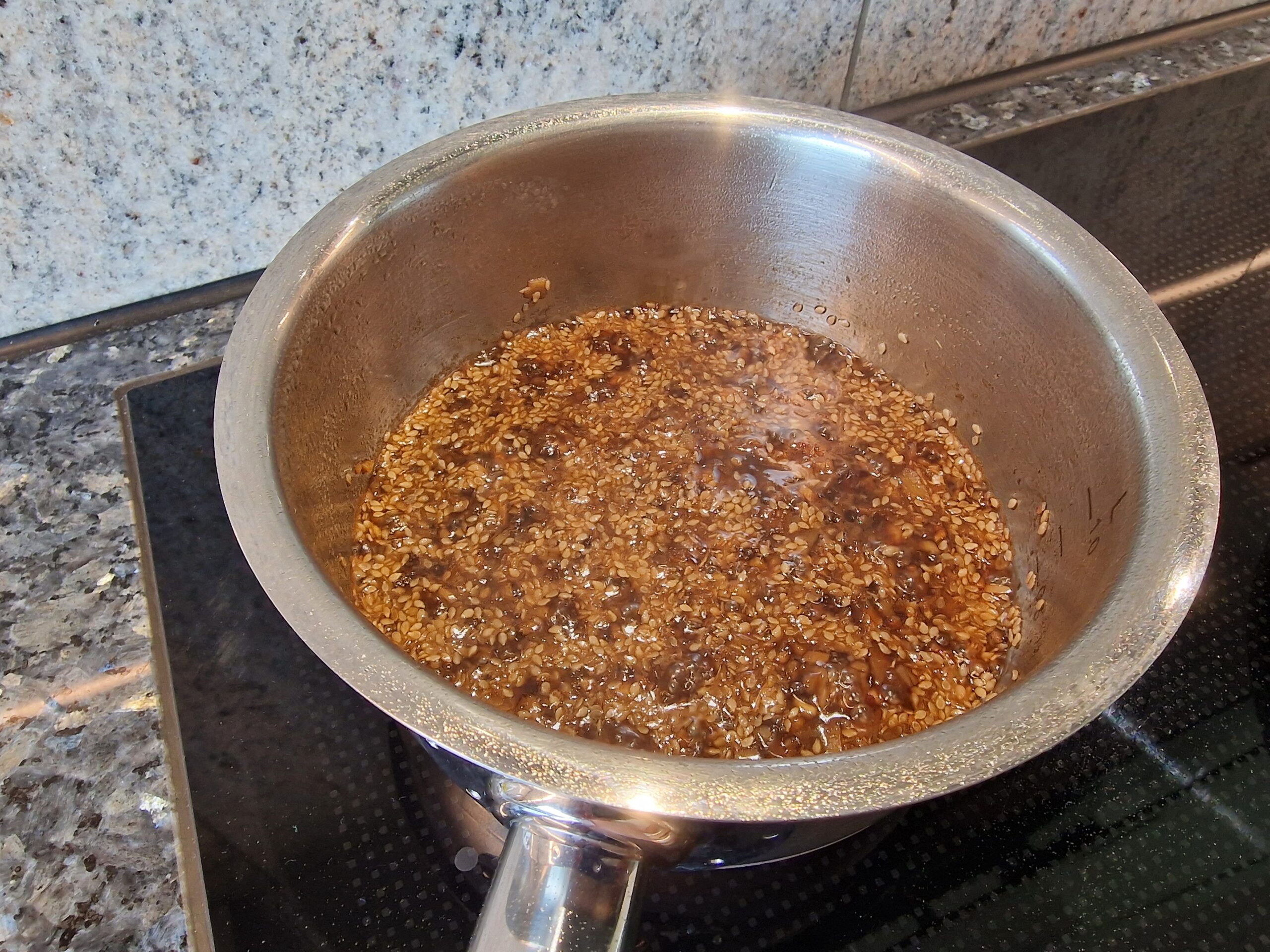Sesamsamen in der Pfanne leicht anrösten, dann Ingwer und Knoblauch in Öl leicht anbraten. Nun wird das Ganze mit dem Honig ganz leicht karamellisiert. Zum Schluss Sojasauce, Wein und Orangen- oder Limettensaft zugeben und leise einköcheln lassen, bis die Sauce sämig wird. Orangensaft sorgt für einen sanfteren Geschmack, Limettensaft für mehr Frische.