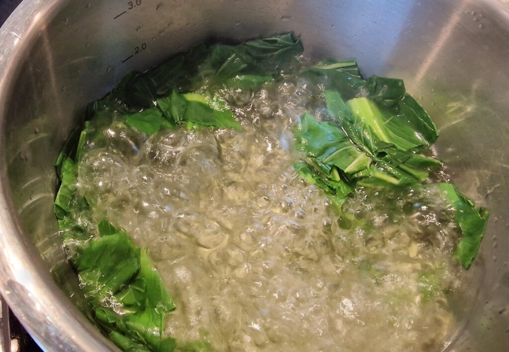 Pak Choi Blätter vom Strunk trennen, waschen, trocknen und die Blätter ohne Stiele zerkleinern. In kochendem Salzwasser die Blätter eine Minute blanchieren, abgießen und mit Salz und Zitronensaft würzen.