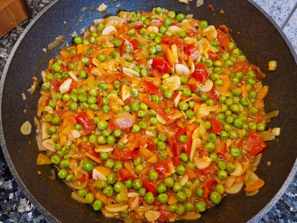 Nun das Ganze auf niedriger Stufe abgedeckt köcheln lassen. Nach einer Viertelstunde etwa die Erbsen zugeben, aufkochen und etwa 10 Minuten auf niedriger Stufe fertig garen.