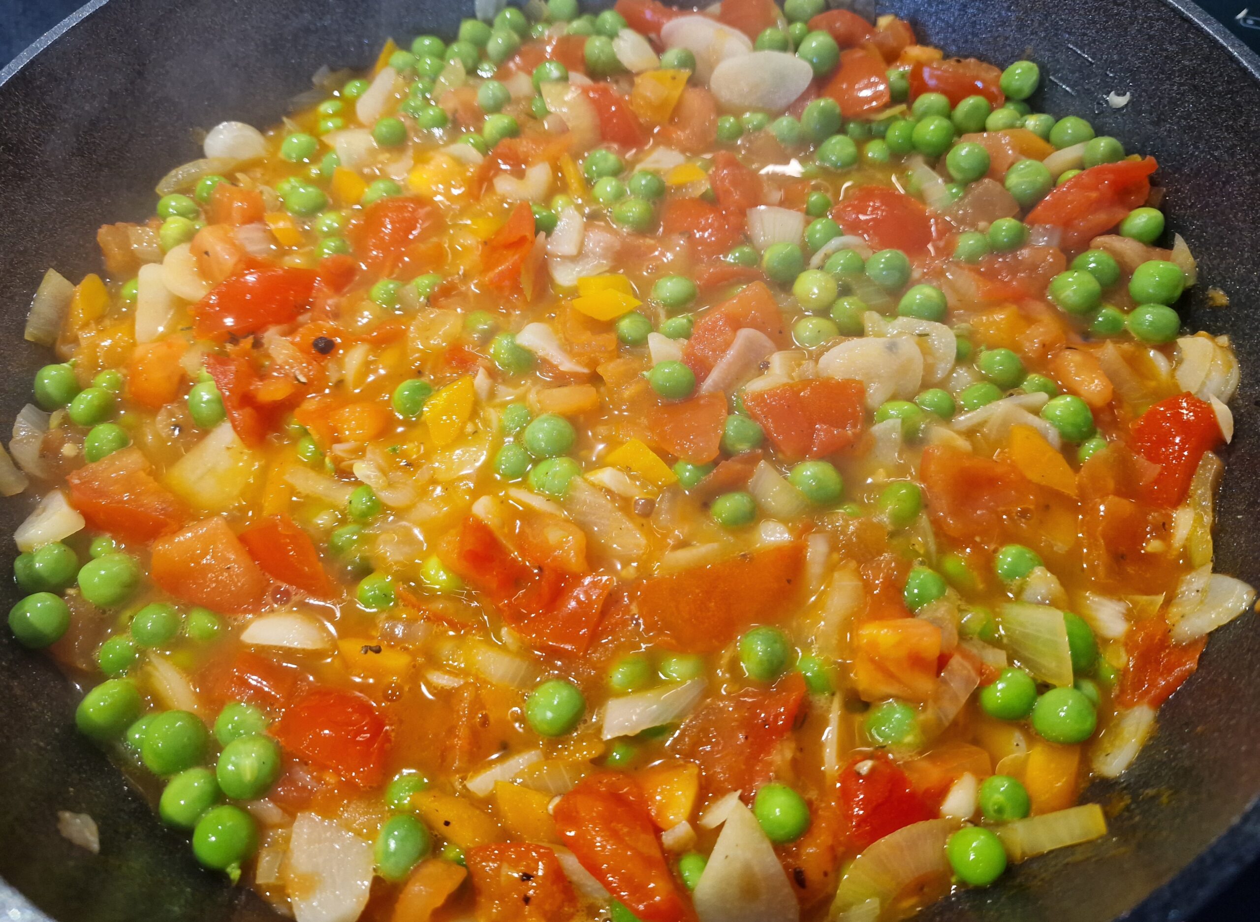 Nun das Ganze auf niedriger Stufe abgedeckt köcheln lassen. Nach einer Viertelstunde etwa die Erbsen zugeben, aufkochen und etwa 10 Minuten auf niedriger Stufe fertig garen.