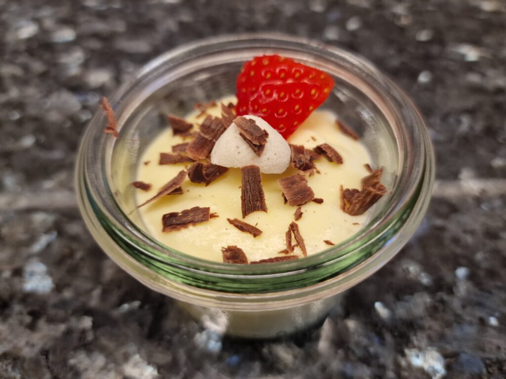 In der Zwischenzeit die Sahne steif schlagen. Nach der Abkühlzeit der Eicreme die geschlagene Sahne sanft unter die Zitronencreme heben und die Creme portionieren. Vor dem Servieren weitere 2 Stunden im Kühlschrank kühlen.