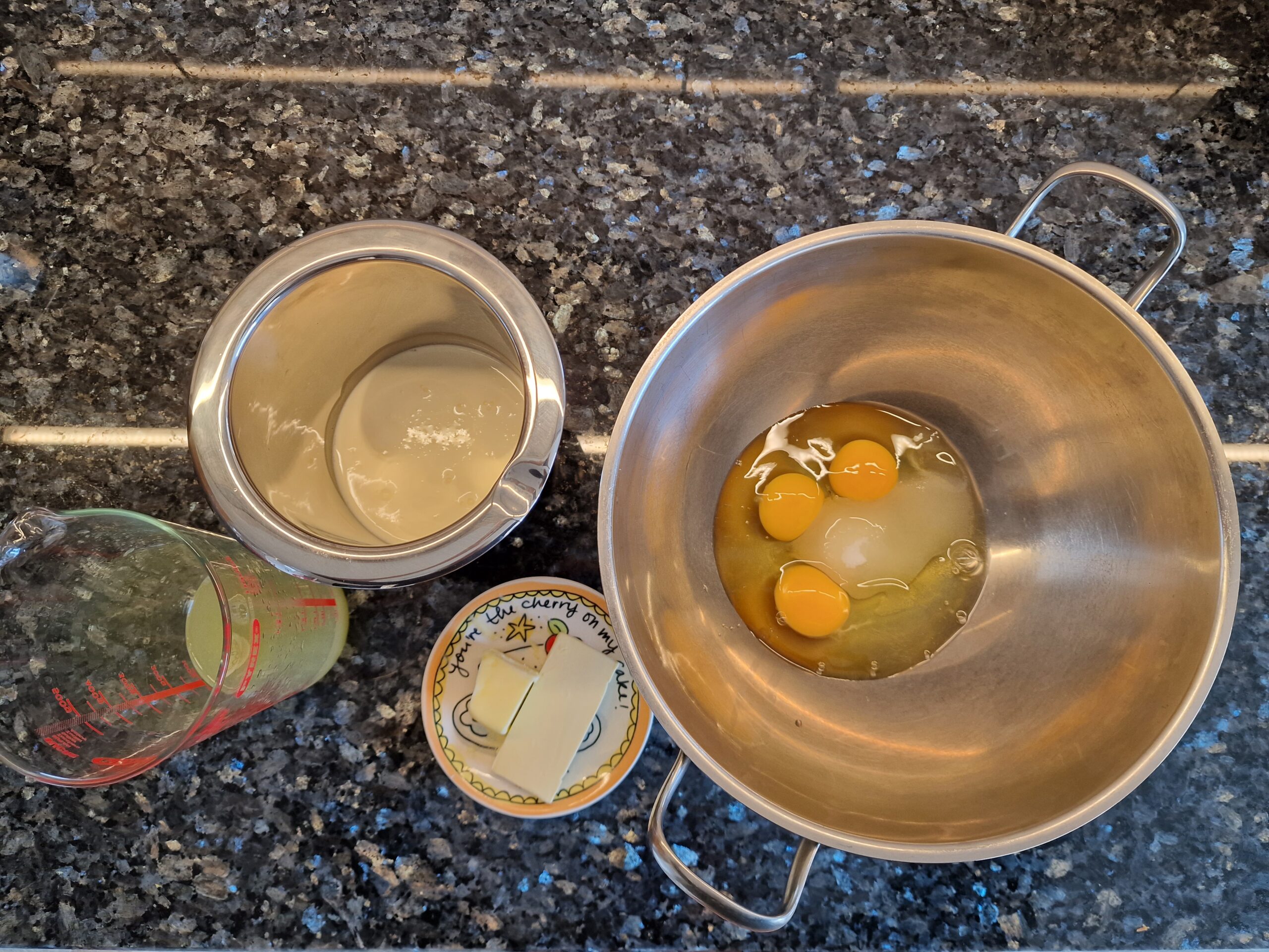 Eier und Zucker mit Limettensaft in einer Schüssel aus Edelstahl mit rundem Boden verrühren, das ermöglicht die direkte weitere Verarbeitung im Wasserbad. Schüssel nun über einem Wasserbad erwärmen und den Mix mit einem Schneebesen dabei ständig schlagen bis die Creme dick-schaumig wird. Schüssel nun vom Wasserbad nehmen und die Butter in kleinen Flocken unterrühren. Die Masse abgedeckt etwa eine halbe Stunde im Kühlschrankkalt stellen.