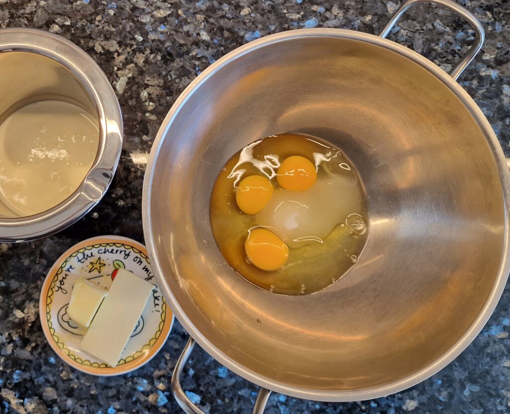 Eier, Limettensaft und Zucker in einer Schüssel aus Edelstahl mit rundem Boden verrühren, das ermöglicht die direkte weitere Verarbeitung im Wasserbad. Schüssel nun über einem Wasserbad erwärmen und den Mix mit einem Schneebesen dabei ständig schlagen bis die Creme dick-schaumig wird. Schüssel nun vom Wasserbad nehmen und die Butter in kleinen Flocken unterrühren. Die Mangostücke pürieren und unterheben. Masse abgedeckt etwa eine halbe Stunde im Kühlschrank kalt stellen.