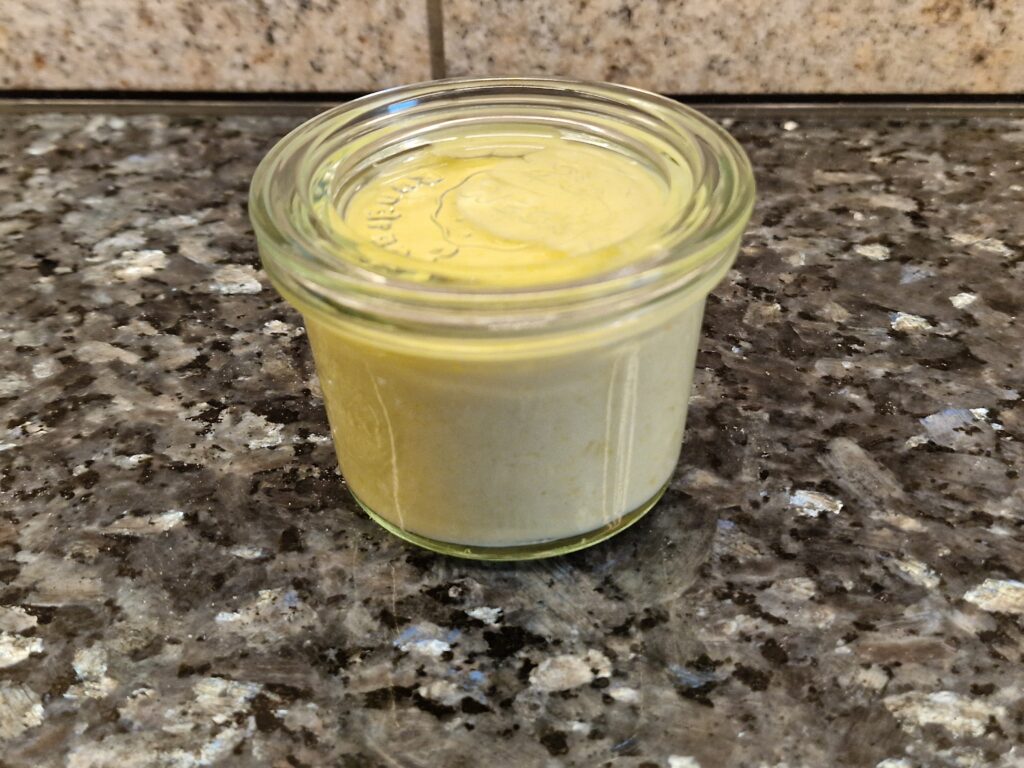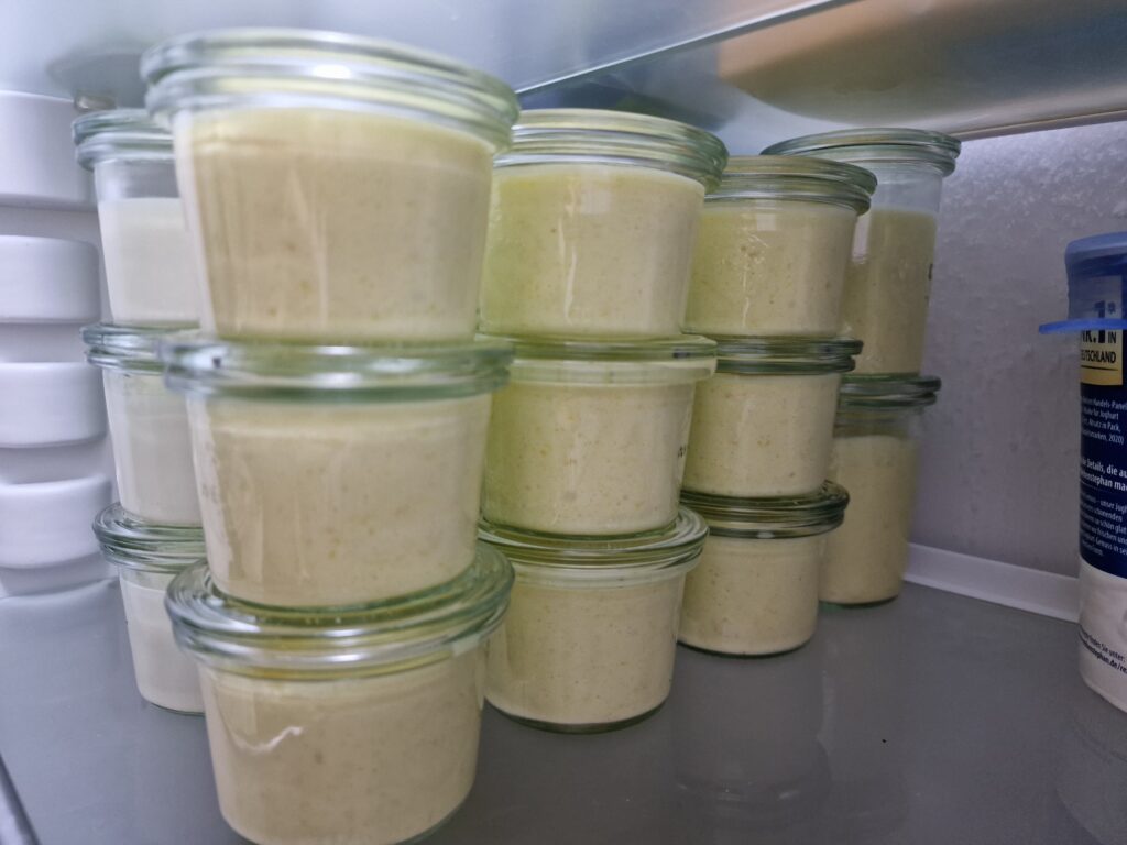 In der Zwischenzeit die Sahne steif schlagen. Nach der Abkühlzeit der Eicreme die geschlagene Sahne sanft unter die Mangocreme heben und die Creme portionieren. Vor dem Servieren weitere 2 Stunden im Kühlschrank kühlen.