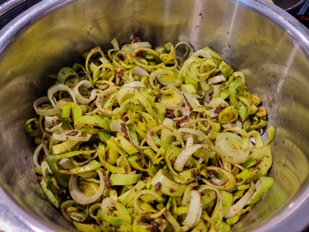 Cumin anrösten und etwas Butter zugeben. Jalapeño und Porree dazu geben und sanft anrösten, dann Knoblauch zugeben. Mit Sojasauce und Honig ablöschen. Nun Crème fraîche zugeben und mit Muskatnuss abschmecken.