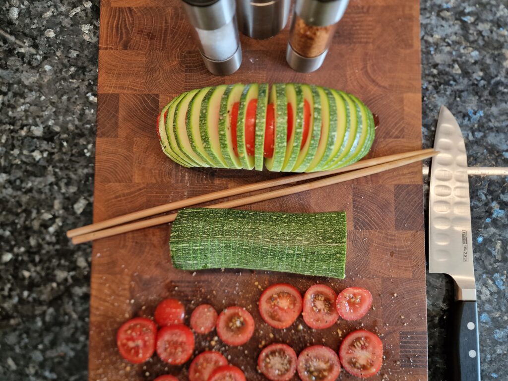 Tipp: Um Zucchini fächerförmig zu schneiden, legt man am Besten auf beide Seiten einen Kochlöffel oder Stäbchen, was die Schnitttiefe begrenzt.