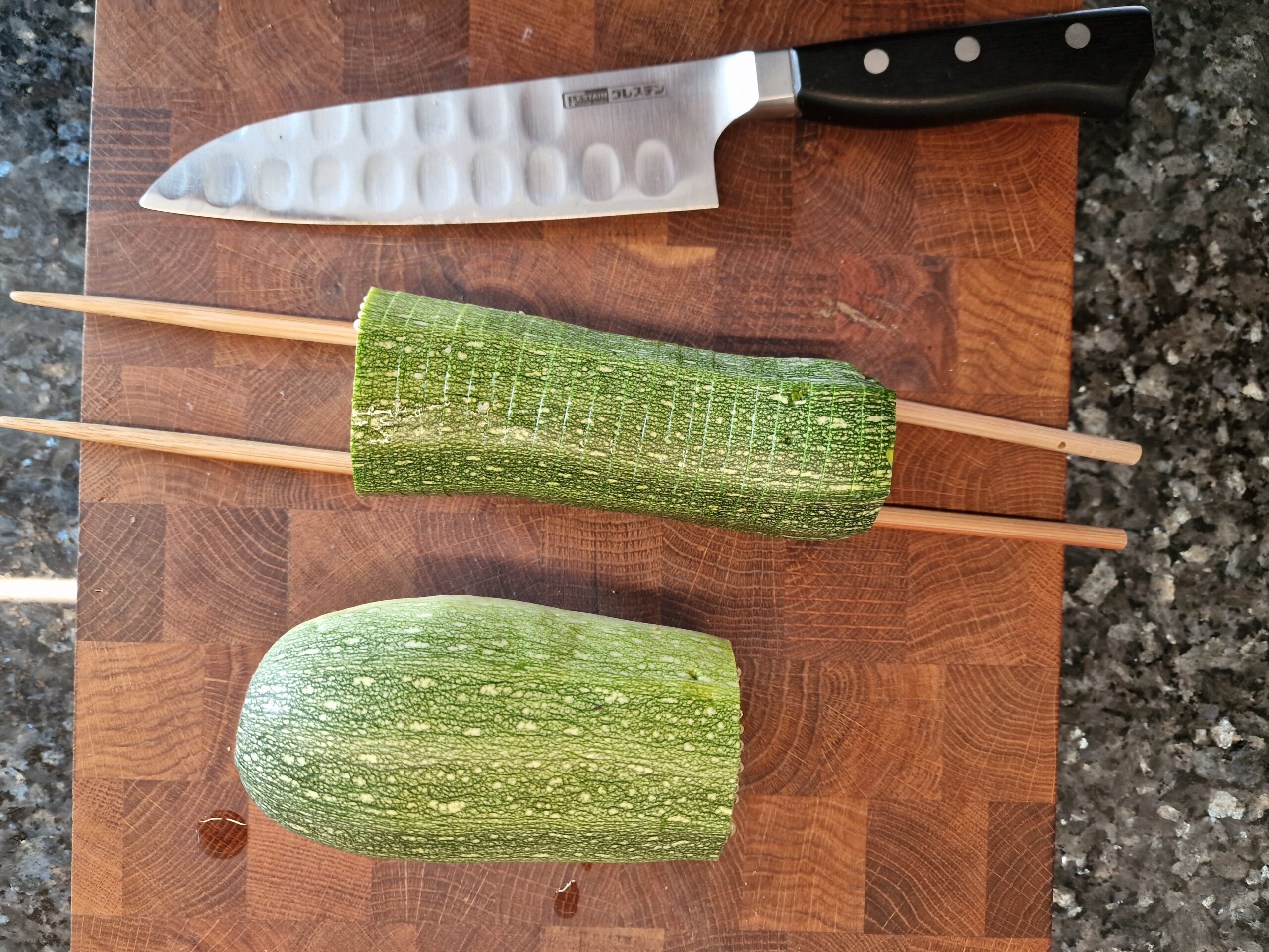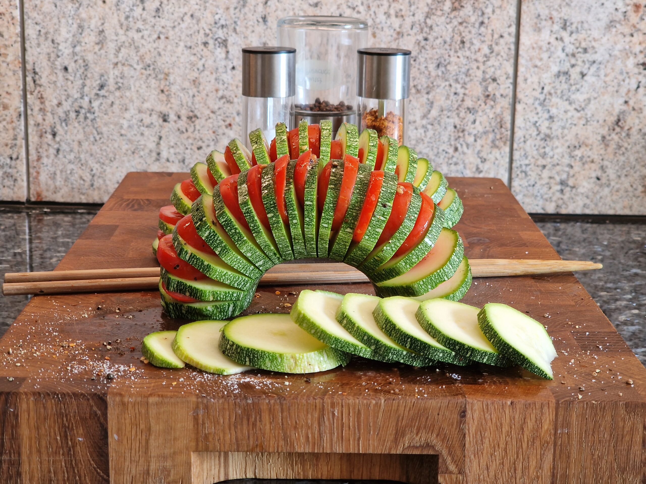 Tipp: Um Zucchini fächerförmig zu schneiden, legt man am Besten auf beide Seiten einen Kochlöffel oder Stäbchen, was die Schnitttiefe begrenzt.