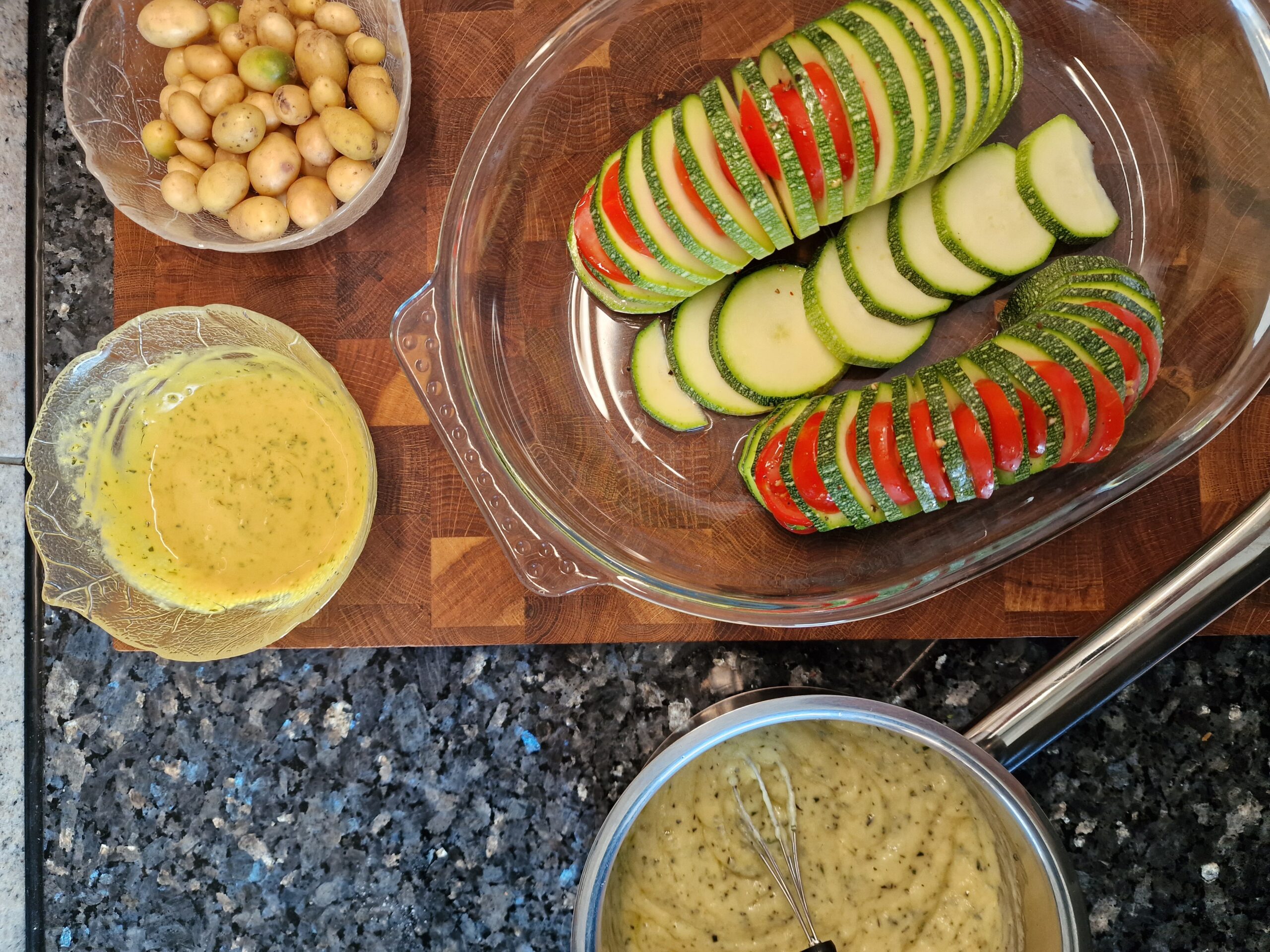 Zucchini auf den Schnittflächen im Fächer pfeffern und salzen, dann die Tomatenscheiben zwischen die Zucchinischeiben schieben und alles in eine Auflaufform oder auf ein tieferes mit Backtrennpapier ausgelegtes Backblech geben.