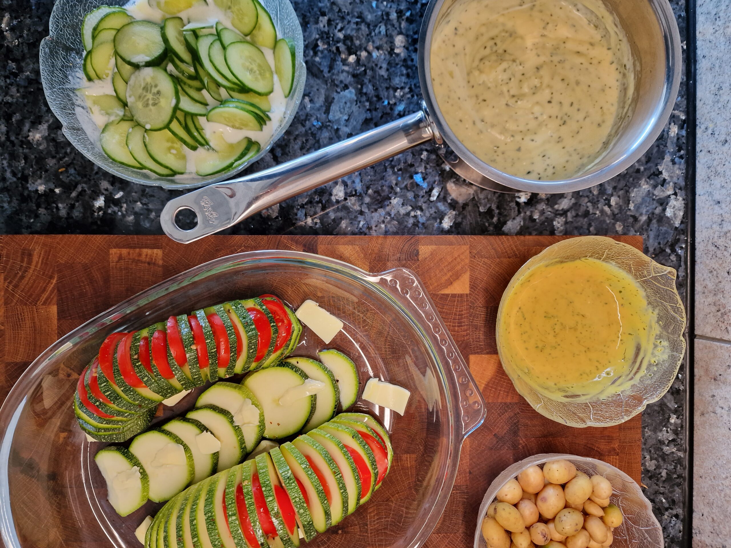 Dazu schmeckt sommerlicher Gurkensalat und Bratkartoffeln.