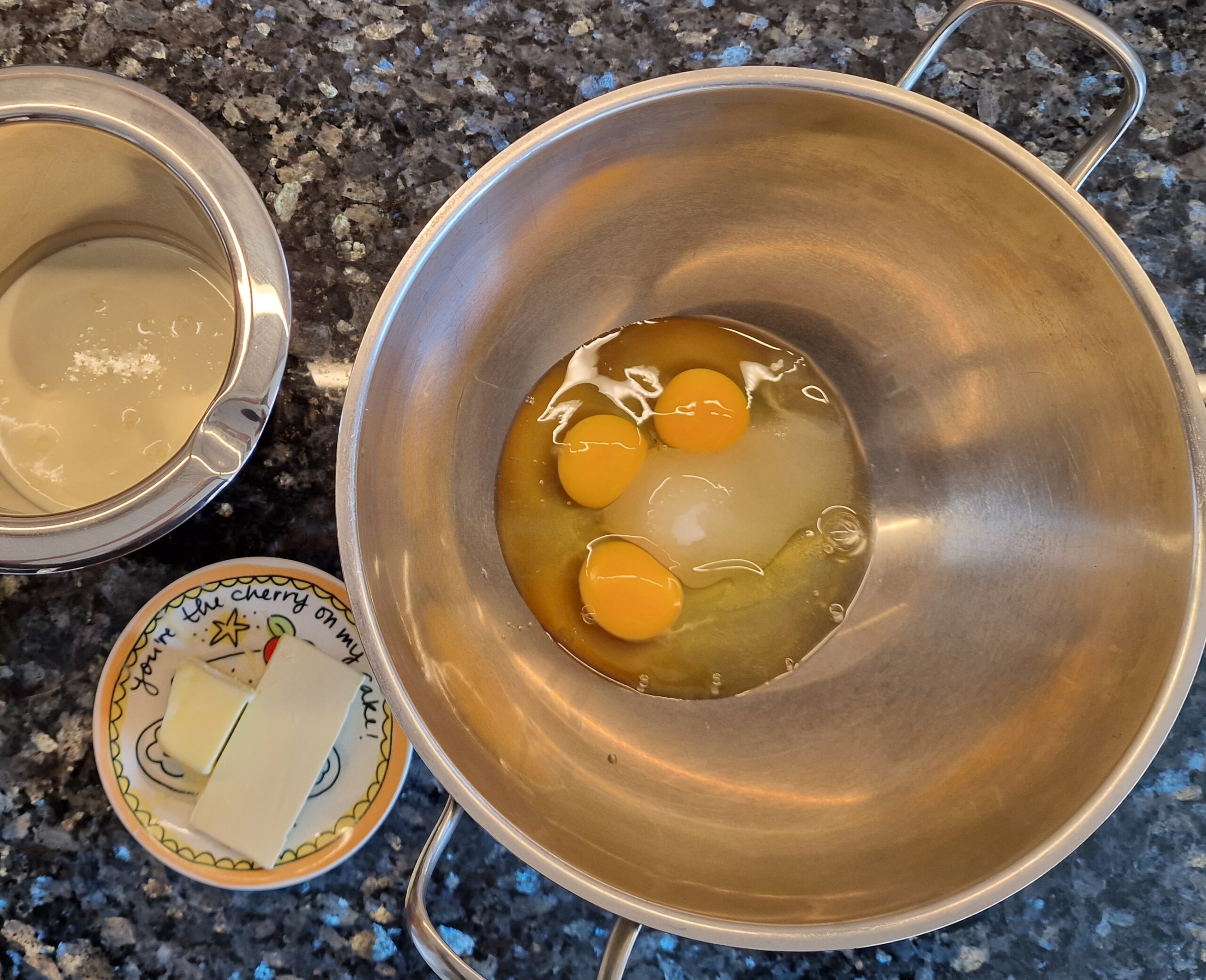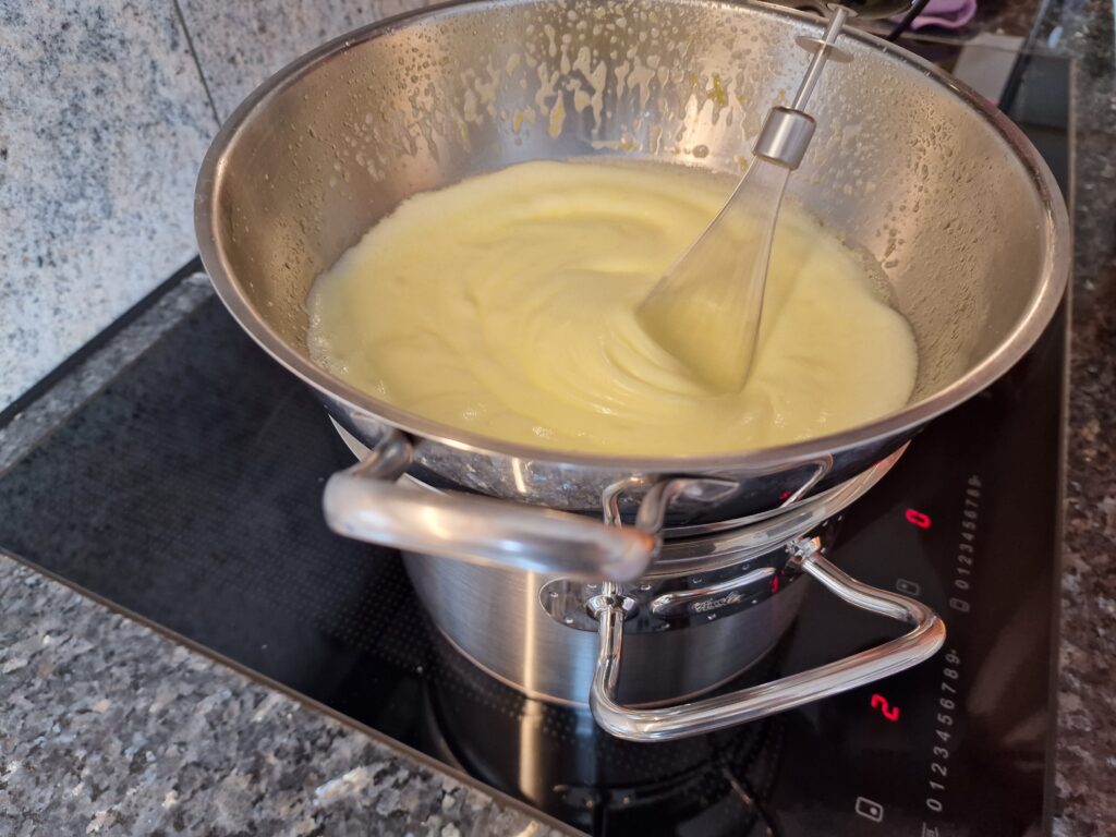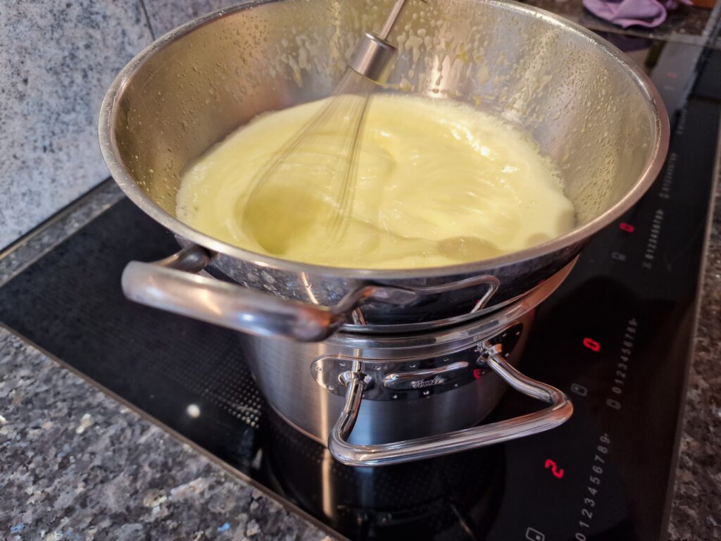 Eier, Limettensaft und Zucker in einer Schüssel aus Edelstahl mit rundem Boden verrühren, das ermöglicht die direkte weitere Verarbeitung im Wasserbad. Schüssel nun über einem Wasserbad erwärmen und den Mix mit einem Schneebesen dabei ständig schlagen bis die Creme dick-schaumig wird (nicht über 82°C). Schüssel nun vom Wasserbad nehmen und die Butter in kleinen Flocken unterrühren. Den Erdbeer-Dicksaft unterheben und die Masse abgedeckt etwa eine halbe Stunde im Kühlschrank kalt stellen.