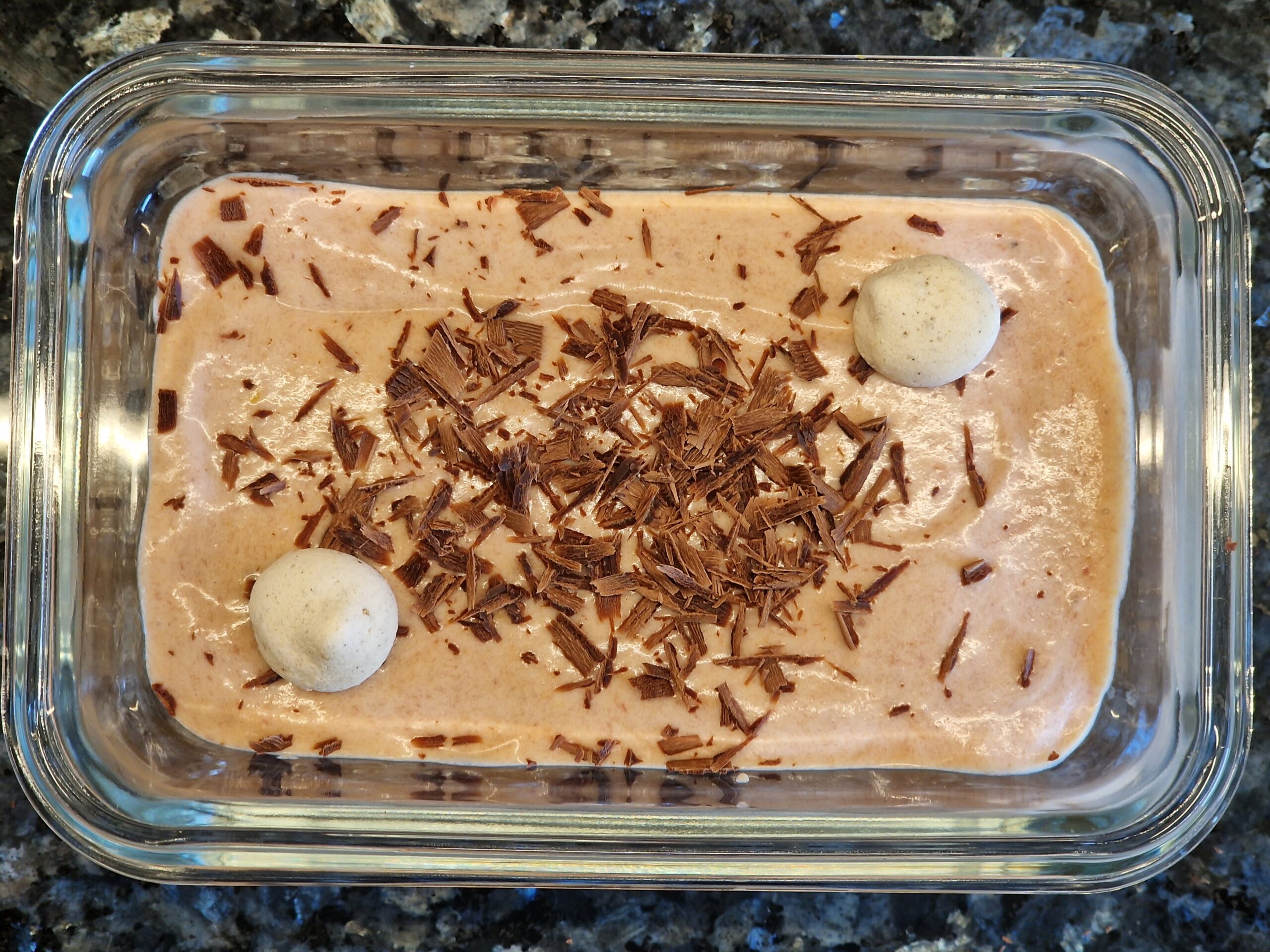 In der Zwischenzeit die Sahne steif schlagen. Nach der Abkühlzeit der Erdbeer-Ei-Masse die geschlagene Sahne sanft unter die Erdbeercreme heben und die Creme portionieren. Vor dem Servieren weitere 2 Stunden im Kühlschrank kühlen, mit Schokostreuseln und Minibaiser dekoriert servieren.