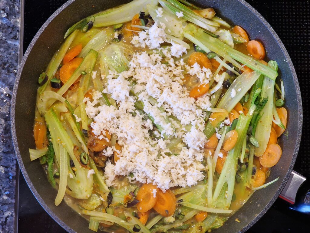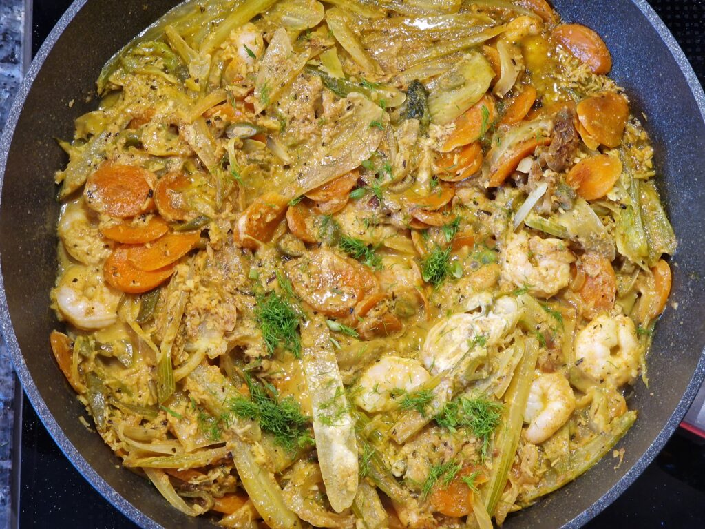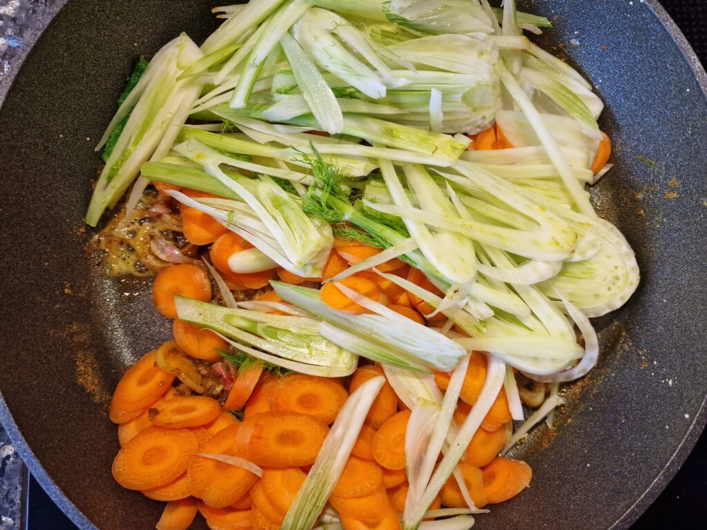 Fenchel ernten und waschen, halbieren, Fenchelkraut abschneiden und beiseite legen. Strunk von Fenchelhälften entfernen, nun die Hälften längs in feine Streifen schneiden. Chili mit Schalotten, Knoblauch und Ingwer in Olivenöl glasig anbraten. Fenchel und Möhren dazu geben, mit anbraten und Currypulver im Anschluss mit anrösten. Mit Gemüsebrühe und Kokosflocken-Milch ablöschen und etwas köcheln lassen, etwa 10-15 Minuten. Mit Salz und Pfeffer abschmecken, Limettensaft und etwas Crème fraîche zugeben. Dann zum Schluss Krabben zugeben und etwa 2 Minuten mit köcheln lassen – wer es vegetarisch möchte, lässt die Krabben weg. Mit dem Fenchelkraut dekorieren.