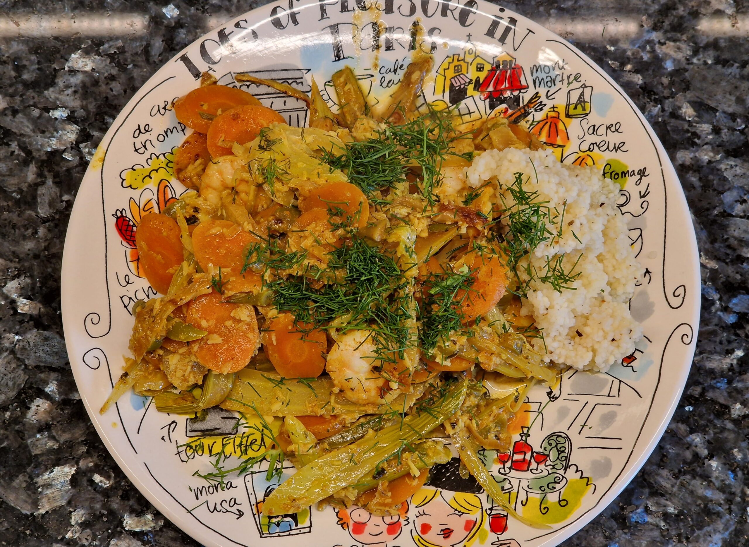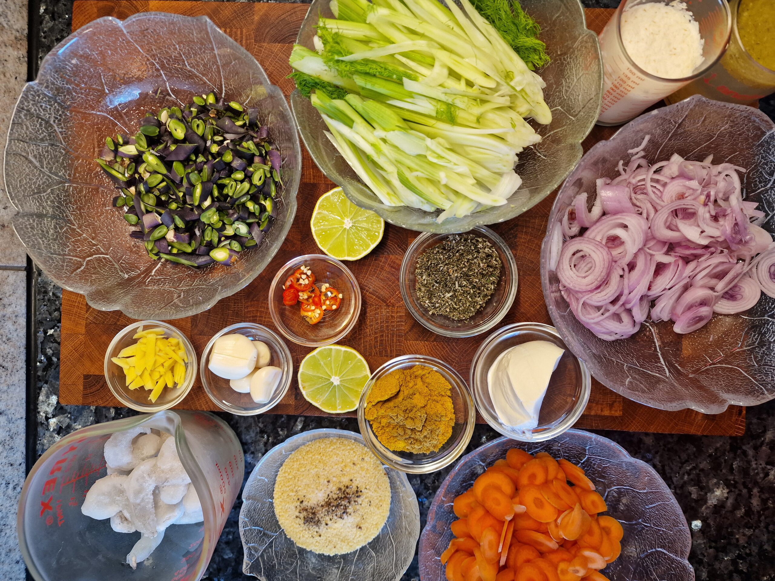 Fenchel ernten und waschen, halbieren, Fenchelkraut abschneiden und beiseite legen. Strunk von Fenchelhälften entfernen, nun die Hälften längs in feine Streifen schneiden. Chili mit Schalotten, Knoblauch und Ingwer in Olivenöl glasig anbraten. Fenchel und Möhren dazu geben, mit anbraten und Currypulver im Anschluss mit anrösten. Mit Gemüsebrühe und Kokosflocken-Milch ablöschen und etwas köcheln lassen, etwa 10-15 Minuten. Mit Salz und Pfeffer abschmecken, Limettensaft und etwas Crème fraîche zugeben. Dann zum Schluss Krabben zugeben und etwa 2 Minuten mit köcheln lassen – wer es vegetarisch möchte, lässt die Krabben weg. Mit dem Fenchelkraut dekorieren.