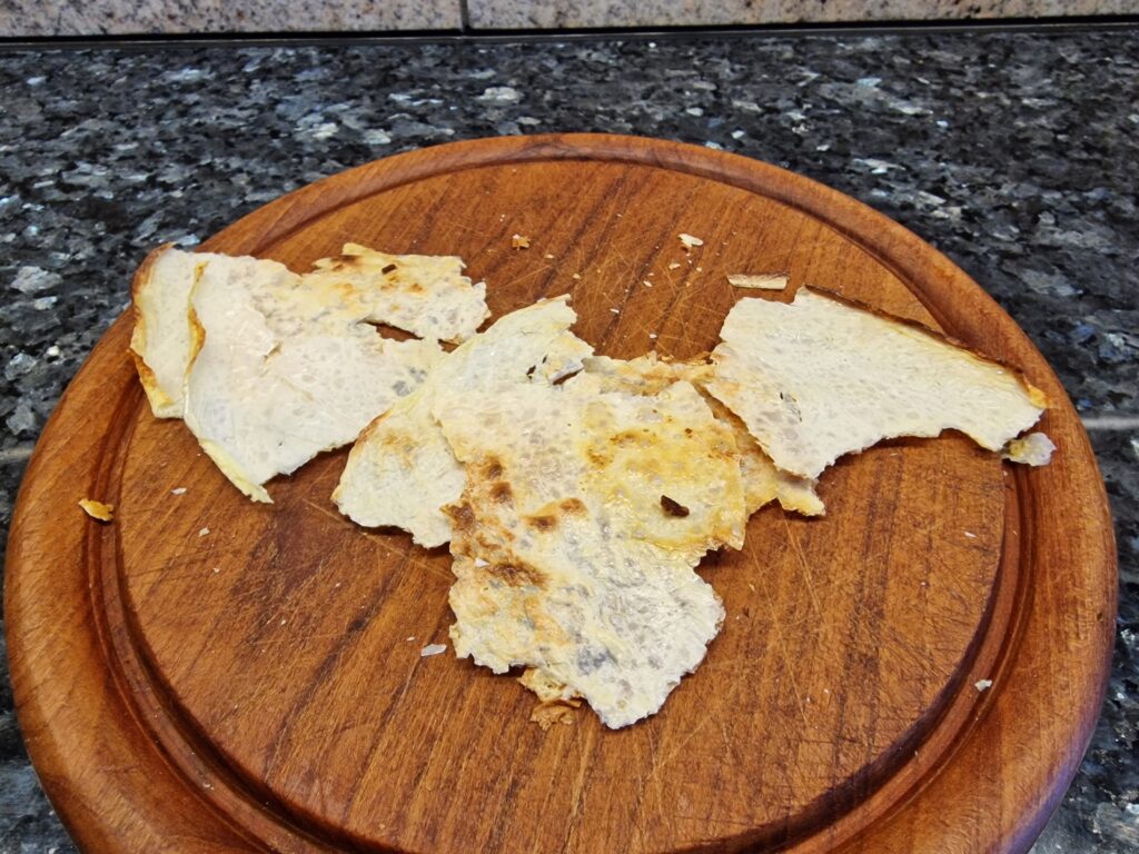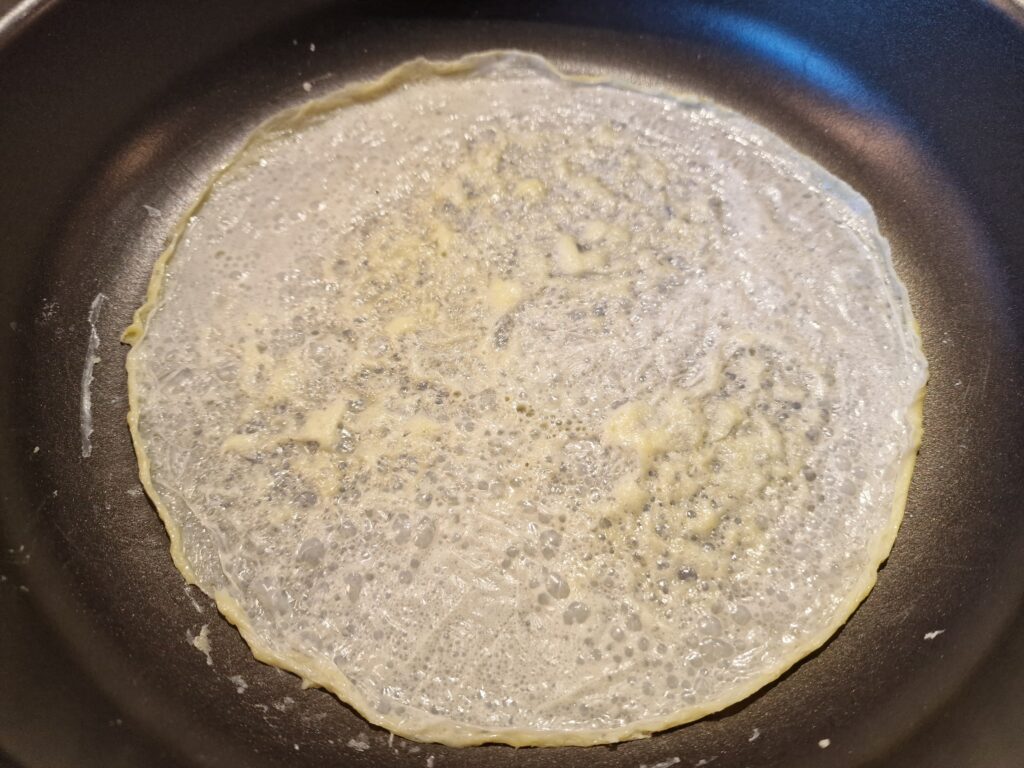 Für die Mille feullie Milch eine beschichtete Pfanne auf mittlere Hitze bringen und vorbereiten, indem man 100 ml Milch in einem kleinen Glas bereit stellt. Die Milchhaut wird hergestellt, indem die Milch in der heißen Pfanne eingekocht wird. Dabei dürfen die entstehenden Blasen nicht zu hoch werden. Die Milch soll also gleichmäßig verdampfen. Dabei immer wieder die Pfanne vorsichtig hin und her schieben und die Masse mit einem Pfannenwender leicht glattstreichen. Die Milchhaut wird hauchdünn fest und nimmt Farbe an, sie erinnert an einen sehr dünnen Crêpe. Vorsichtig aus der Pfanne abziehen und auf einen Teller zum Auskühlen legen und nach dem Abkühlen in kleinere Stücke vierteln.