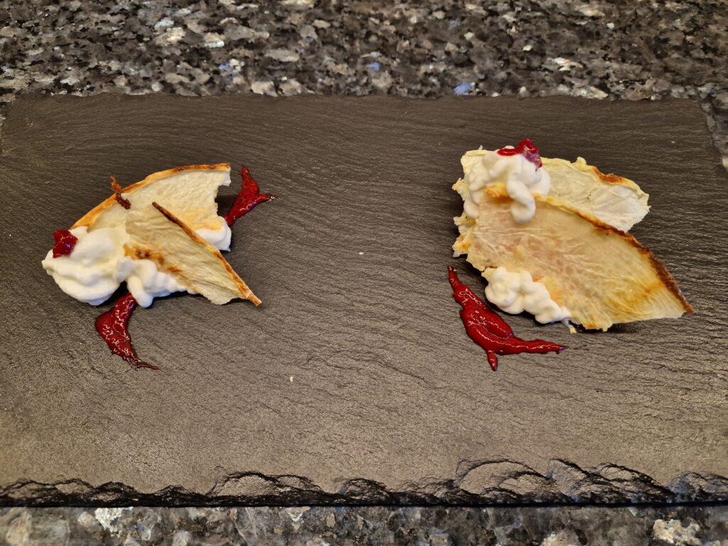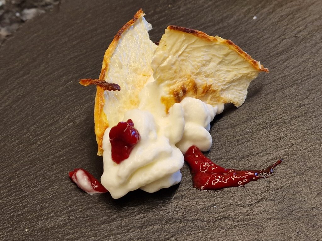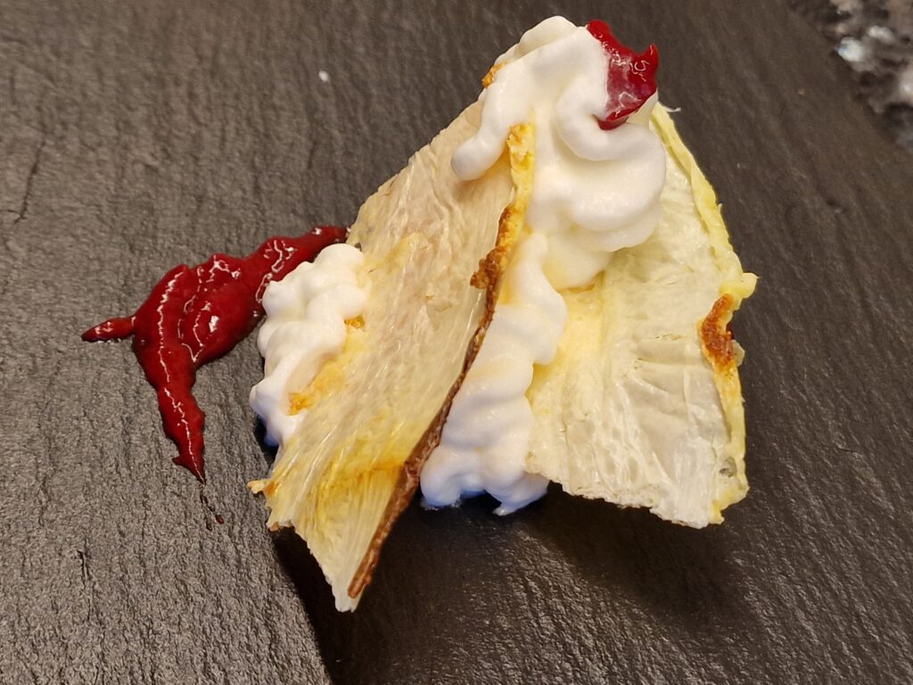 Ein leckeres Dessert, dass allerdings frisch zubereitet werden muss, insbesondere die knusprige Milchhaut, die ihren Biss behalten muss.