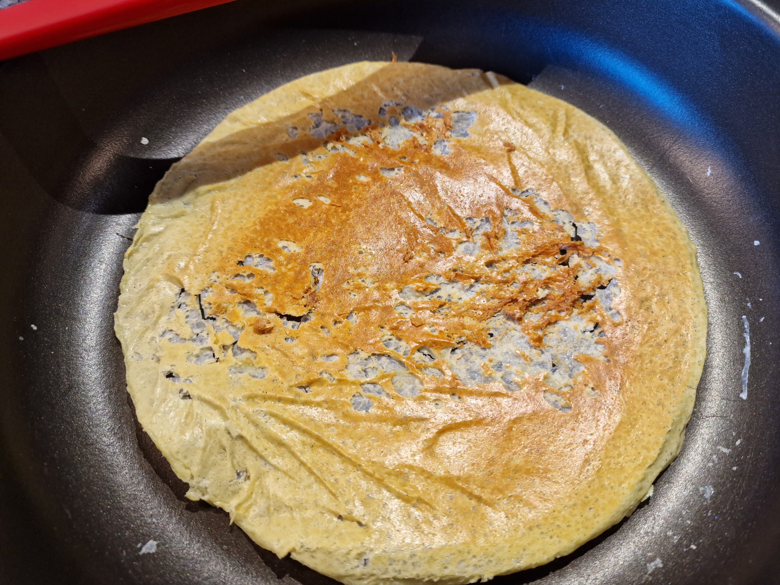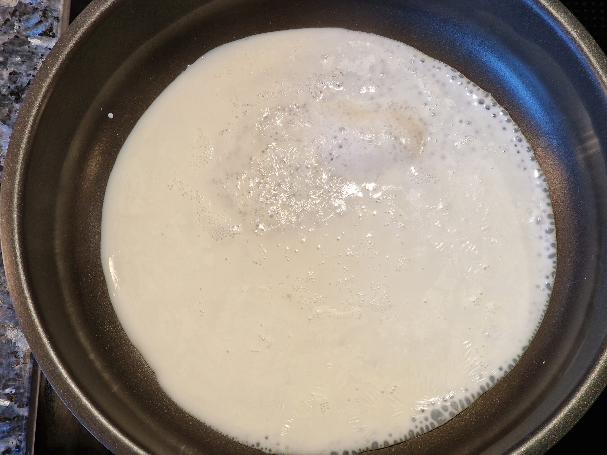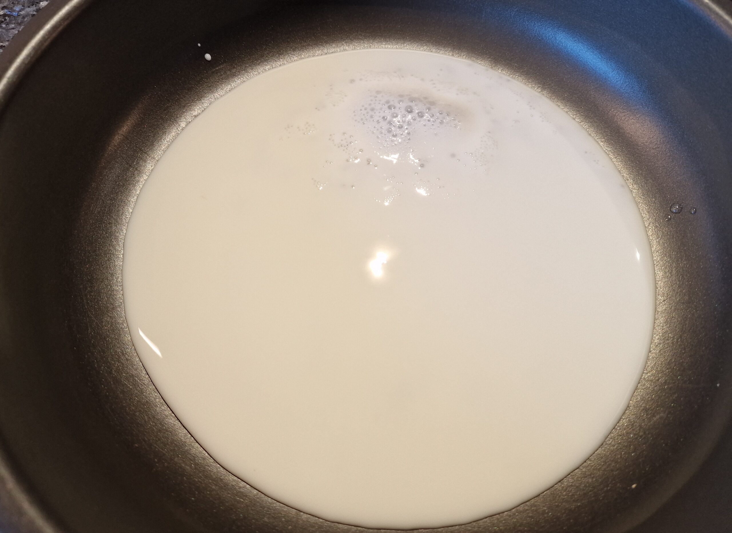 Für die Mille feullie Milch eine beschichtete Pfanne auf mittlere Hitze bringen und vorbereiten, indem man 100 ml Milch in einem kleinen Glas bereit stellt. Die Milchhaut wird hergestellt, indem die Milch in der heißen Pfanne eingekocht wird. Dabei dürfen die entstehenden Blasen nicht zu hoch werden. Die Milch soll also gleichmäßig verdampfen. Dabei immer wieder die Pfanne vorsichtig hin und her schieben und die Masse mit einem Pfannenwender leicht glattstreichen. Die Milchhaut wird hauchdünn fest und nimmt Farbe an, sie erinnert an einen sehr dünnen Crêpe. Vorsichtig aus der Pfanne abziehen und auf einen Teller zum Auskühlen legen und nach dem Abkühlen in kleinere Stücke vierteln.