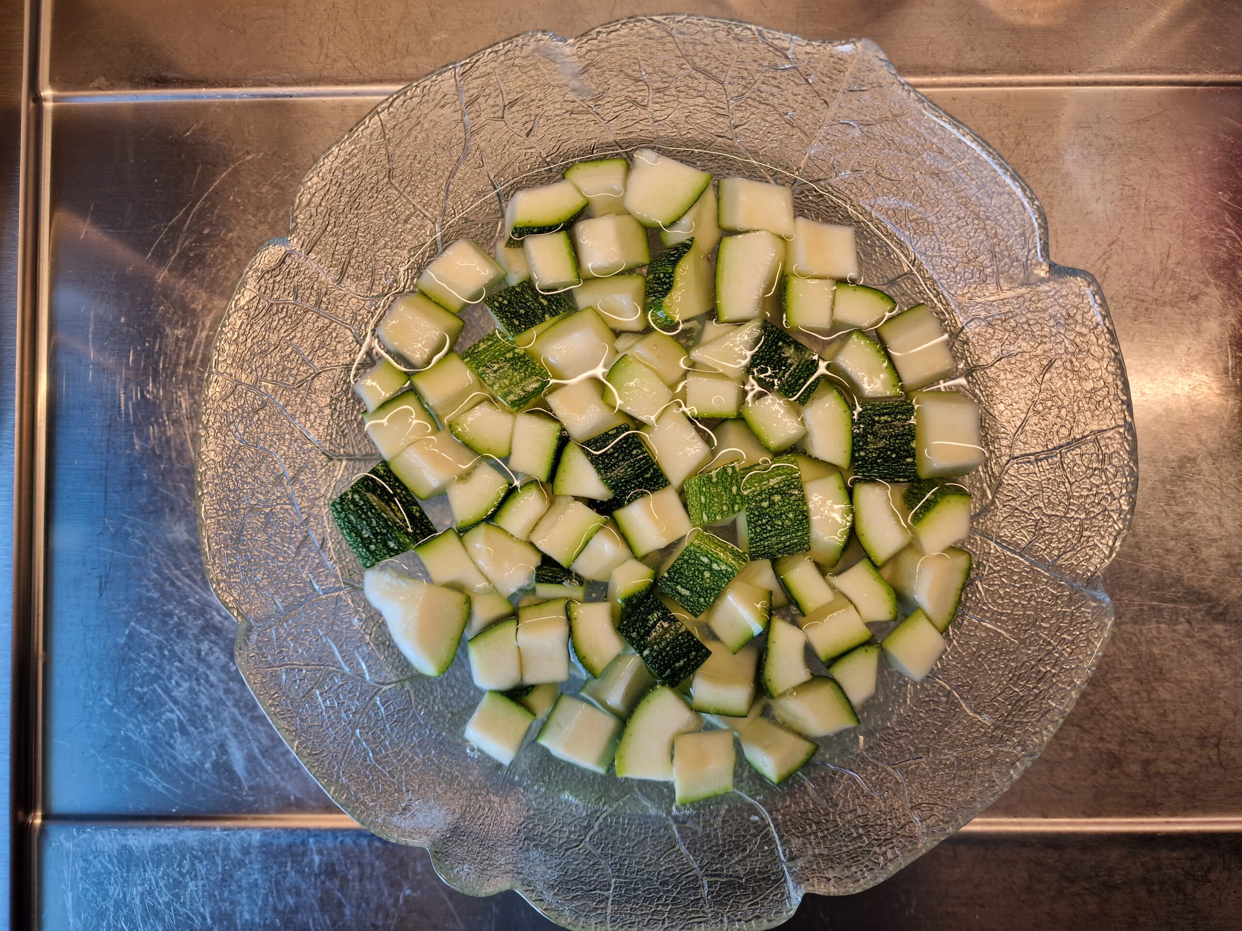 Räucheraal abziehen. Zucchini gewürfelt in etwas Salzwasser etwa 10 Minuten marinieren, um die Feuchtigkeit abzuziehen. Fenchel längs fein schneiden und das Fenchelkraut fein hacken.