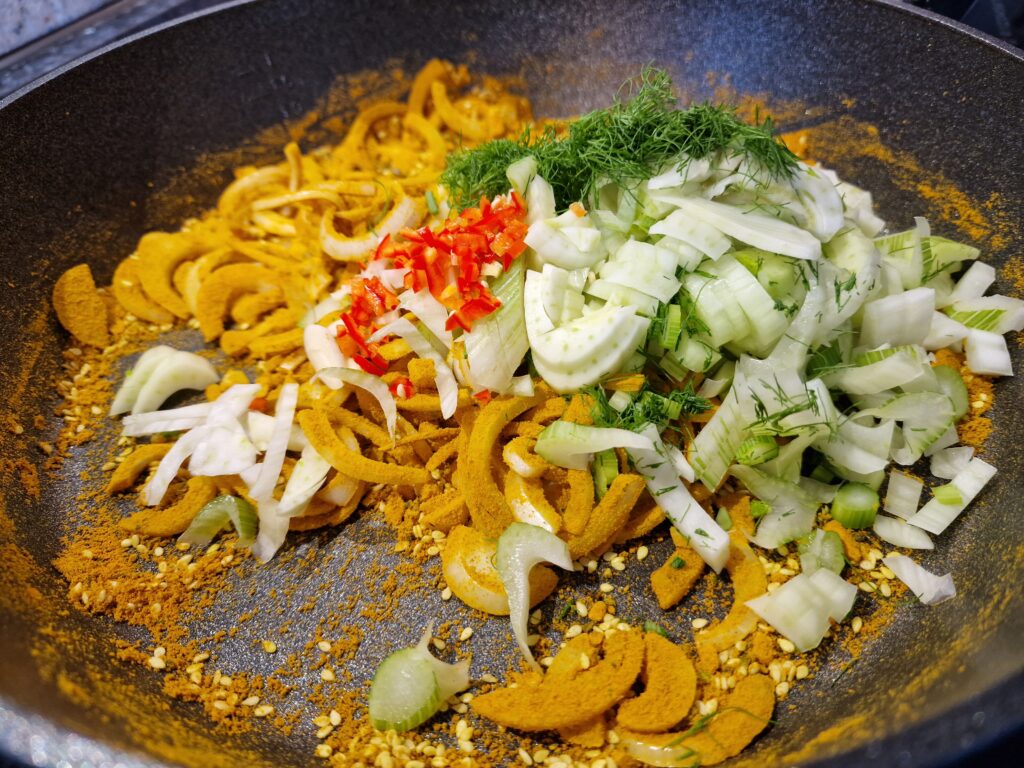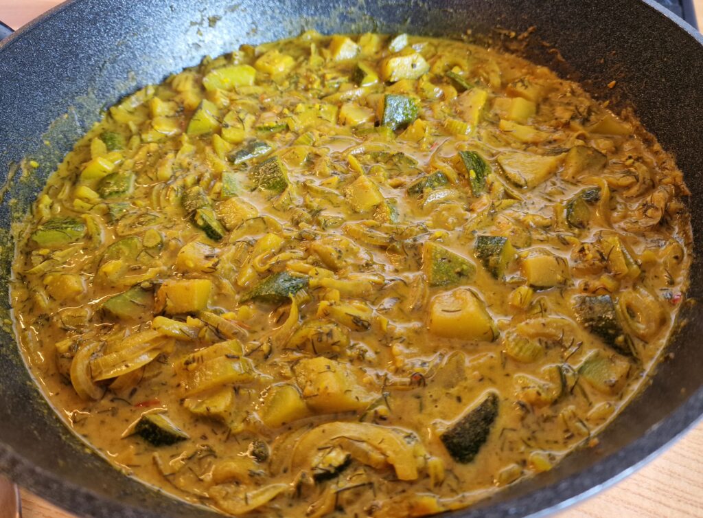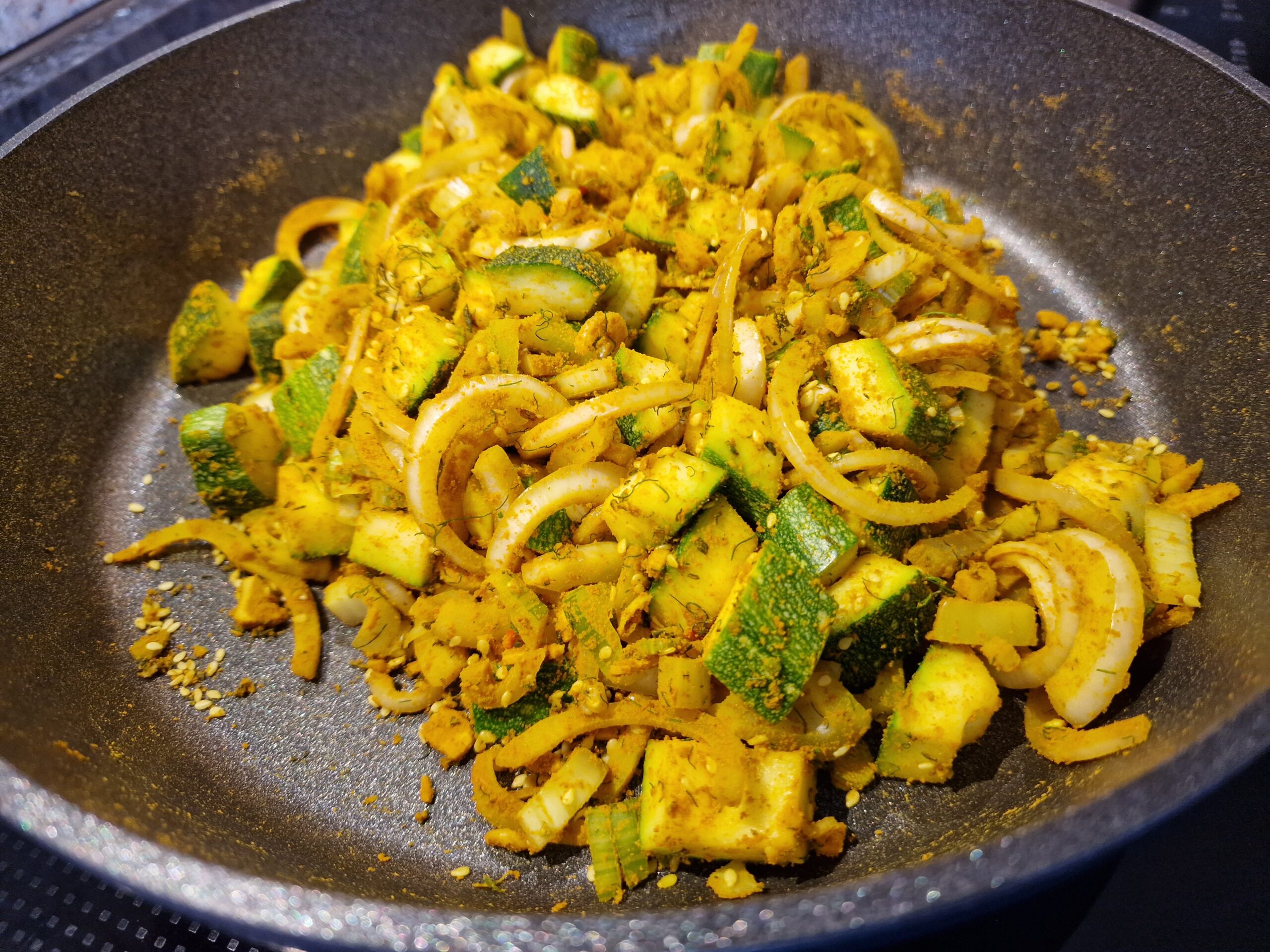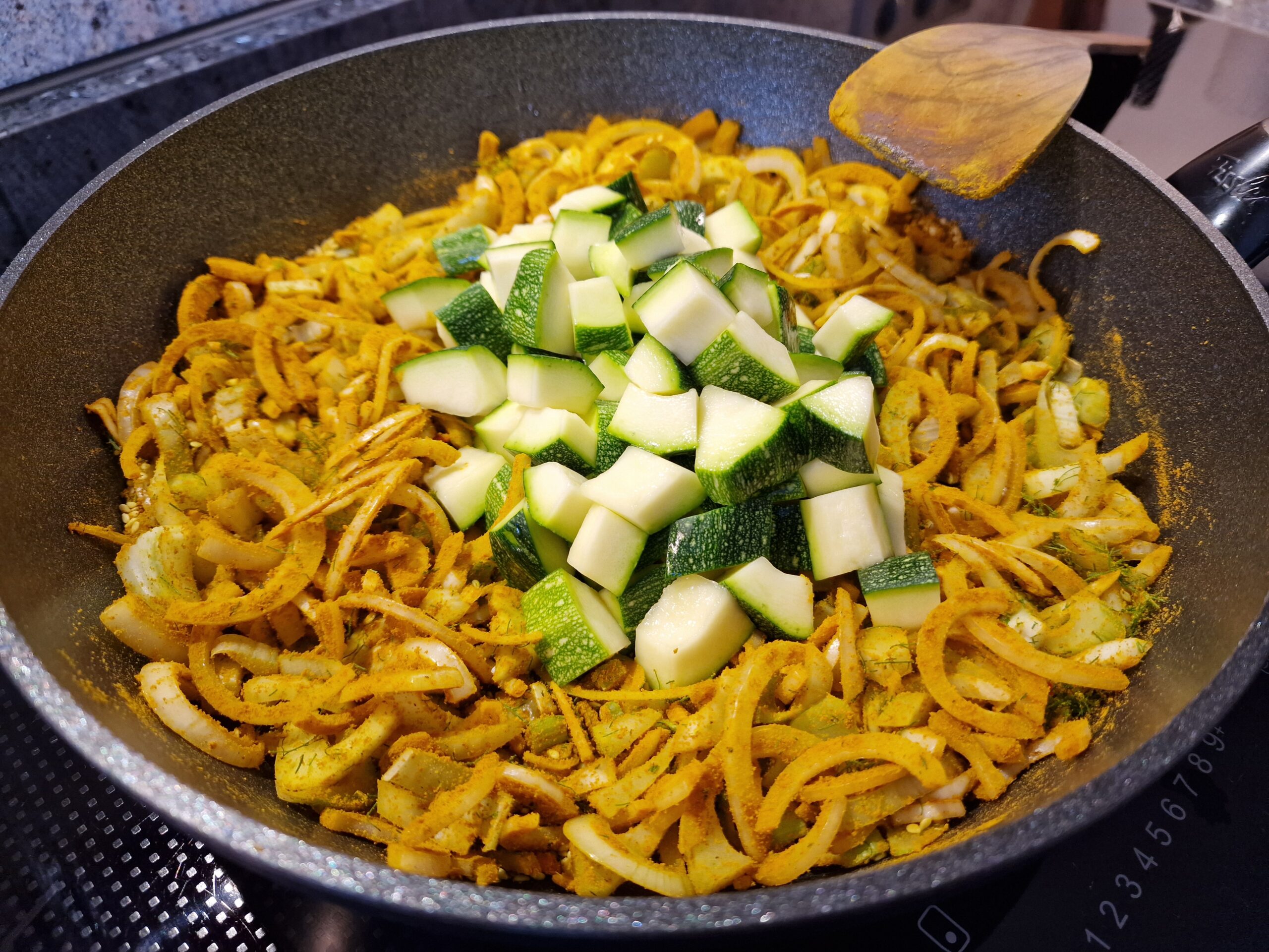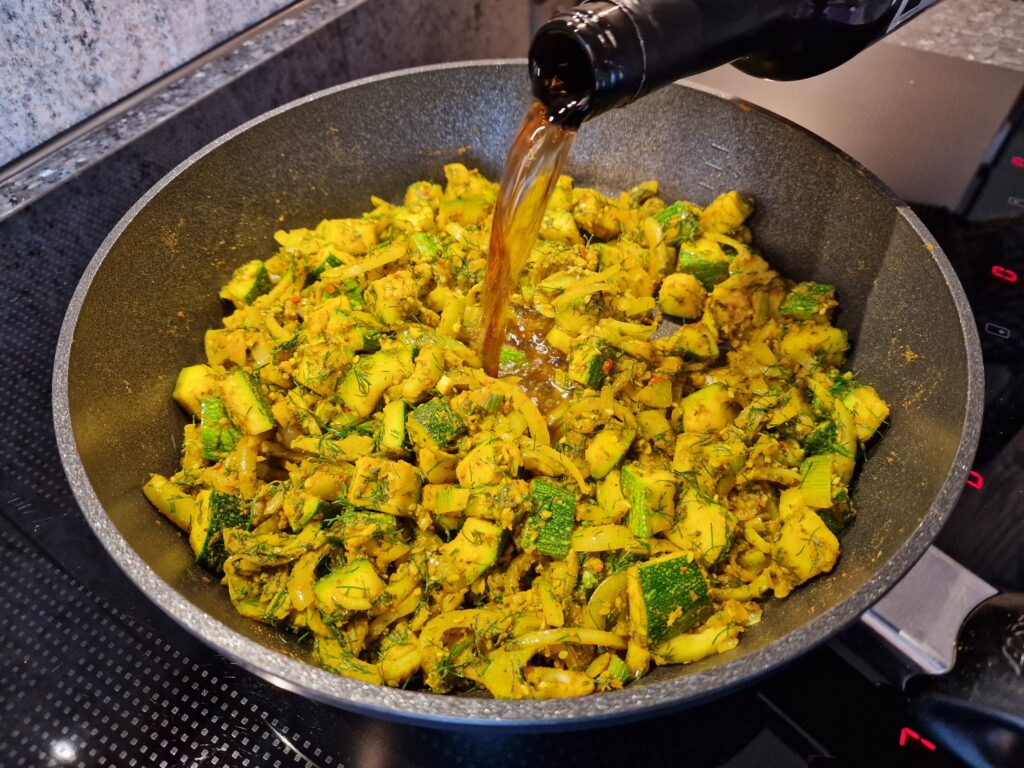 Cumin mit Currypulver und Sesam in der Pfanne ohne Öl anrösten. Zwiebeln und Kräuter dazu geben und mit den Gewürzen mischen. Fenchel, Ingwer, Knoblauch, Fenchelkraut und Chili zugeben und ebenfalls untermischen. Im Anschluss die vorbereiteten Zucchini zugeben. Nun erst etwas Olivenöl beigeben und auf mittlerer Hitze anbraten lassen. Mit Sherry ablöschen, etwas Gemüsebrühe und Salz zusetzen und abgedeckt etwa 20 Minuten köcheln lassen. Mit Crème fraîche abschmecken.