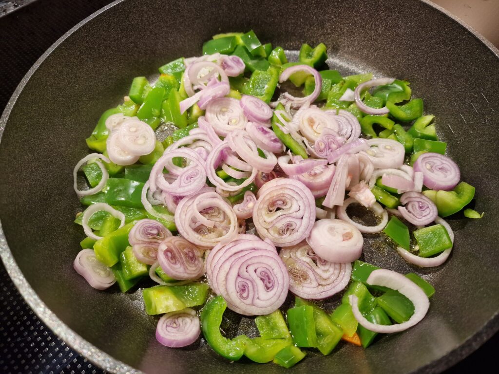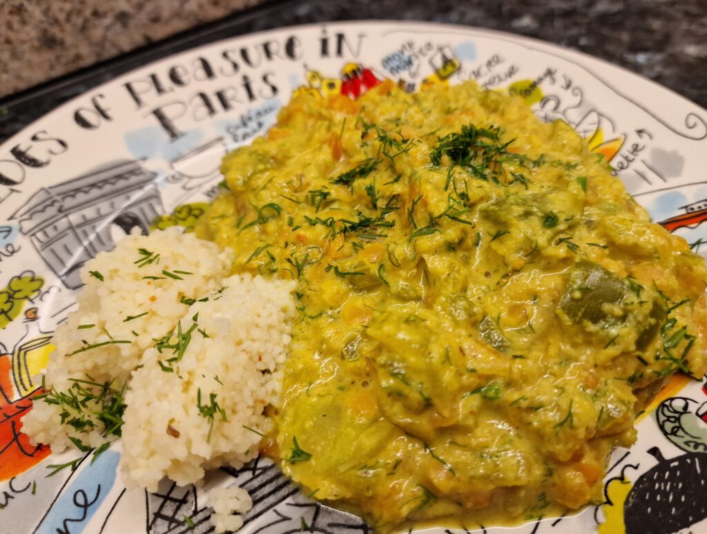 Dazu schmeckt Couscous, das mit etwas Salz, Pfeffer und etwa der doppelten Menge kochendem Wasser aufgegossen wurde. 5 – 10 Minuten quellen lassen, bis kein Wasser mehr zu sehen ist.