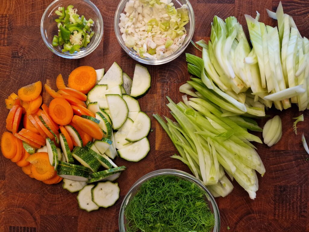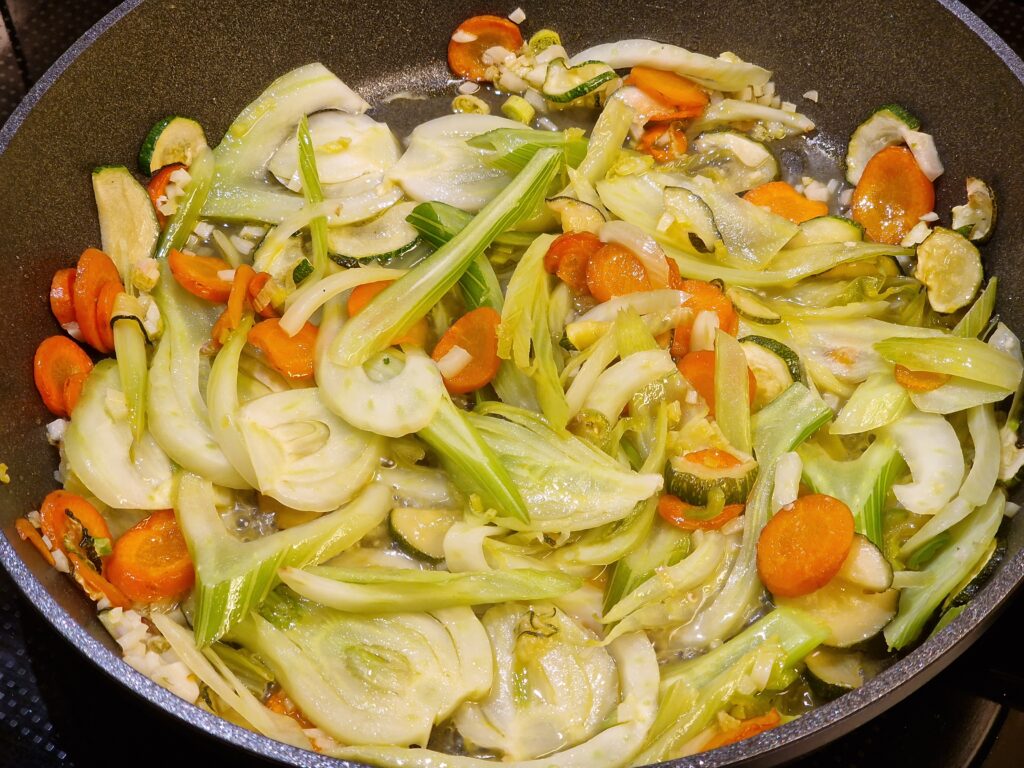 Zuerst Möhrenscheiben und dann zusammenhängende Fenchelstreifen in erhitztem Olivenöl bei mittlerer Einstellung mit dem Chili beidseitig leicht anbraten und bräunen.