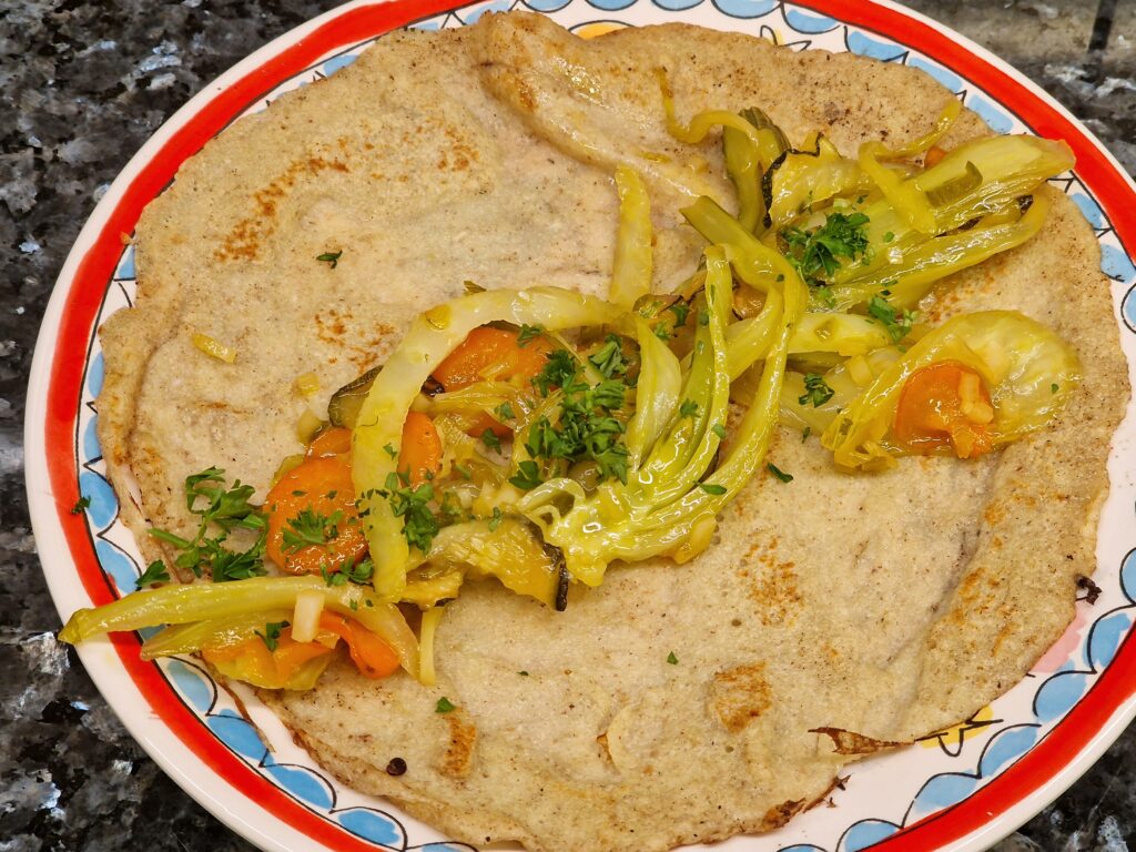 Mit dem restlichen Saft der Orangen ablöschen und die Sauce mit den Fenchelscheiben dicklich einkochen lassen, bis die Stückchen leicht glasig sind. Auf Buchweizenpfannkuchen anrichten, einrollen und mit der Sauce leicht überziehen. Mit Salz und Fenchelkraut dekoriert servieren. Wer mag kann mit einem Schuss Curaçao, Grand Manier oder Cointreau dies herzhafte Buchweizen Pfannkuchen Rezept a la Crêpe Suzette versuchen.