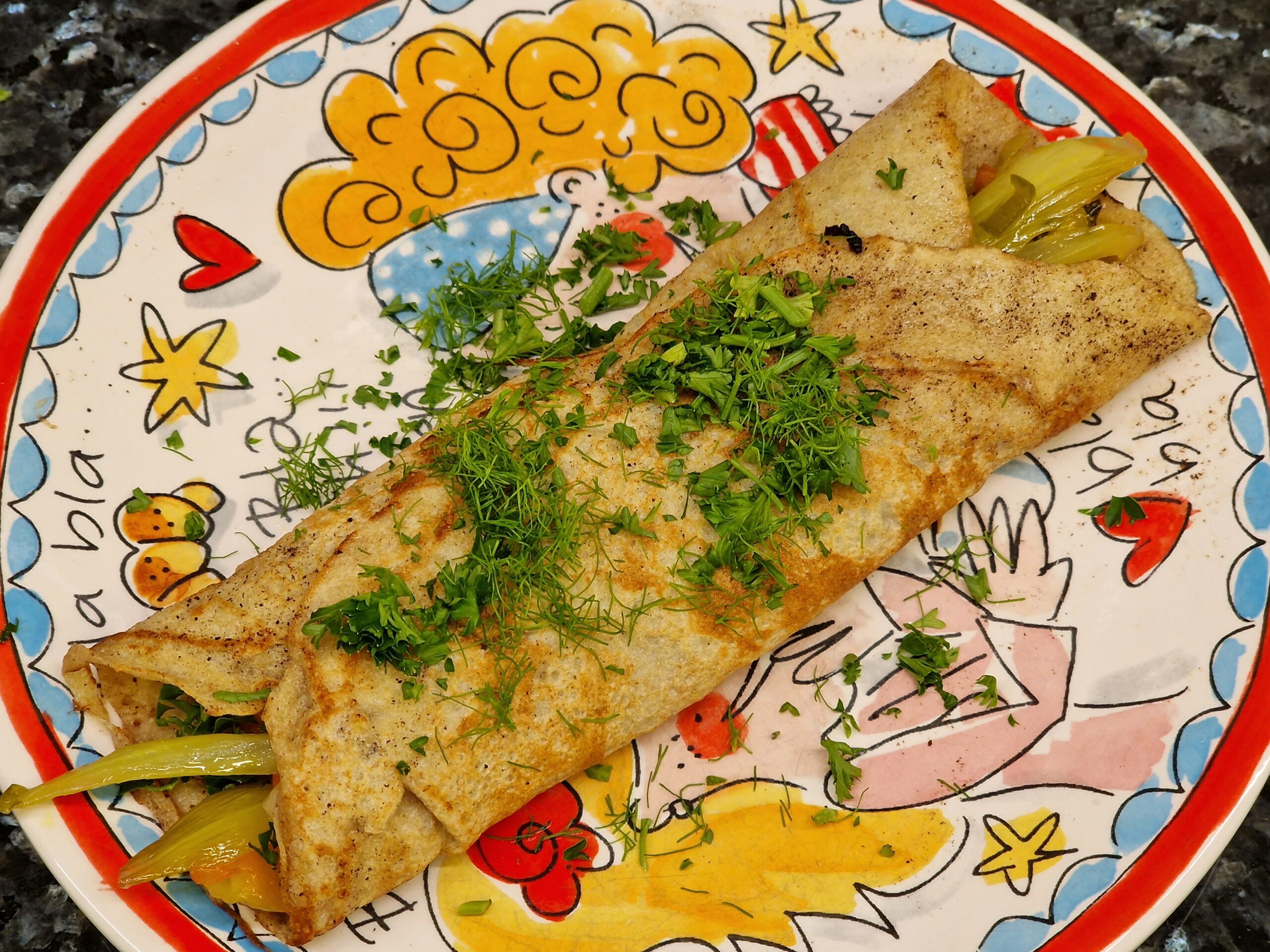 Pfannkuchen auf einen Teller geben. Entweder mit süßen Zutaten – wie Ahornsirup, Honig oder Zucker und Zimt – oder herzhaften Zutaten – zum Beispiel einem Omelett mit in Scheiben geschnittenen Champignons, fein gewürfeltem Ingwer und frisch gepresstem Knoblauch und Schnittlauch – füllen.