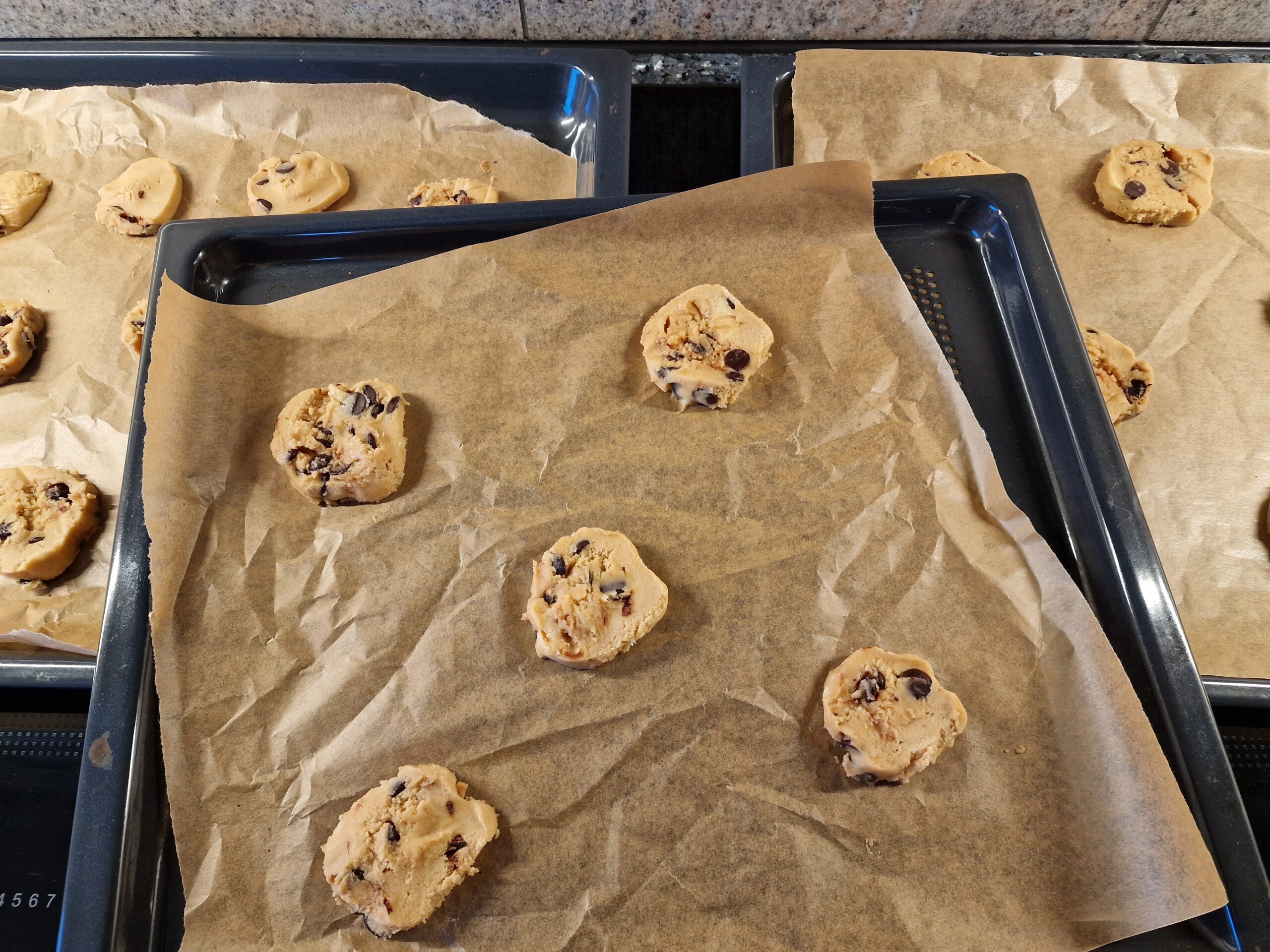 Im Anschluss den Teig zu einer Rolle formen und diese eingeschlagen etwa eine halbe Stunde im Gefrierfach kalt stellen. Die Rolle anschließend in etwa 1 cm dicke Scheiben schneiden und die Keksrohlinge mit weitem Abstand auf das mit Backtrennpapier ausgelegte Backblech legen.